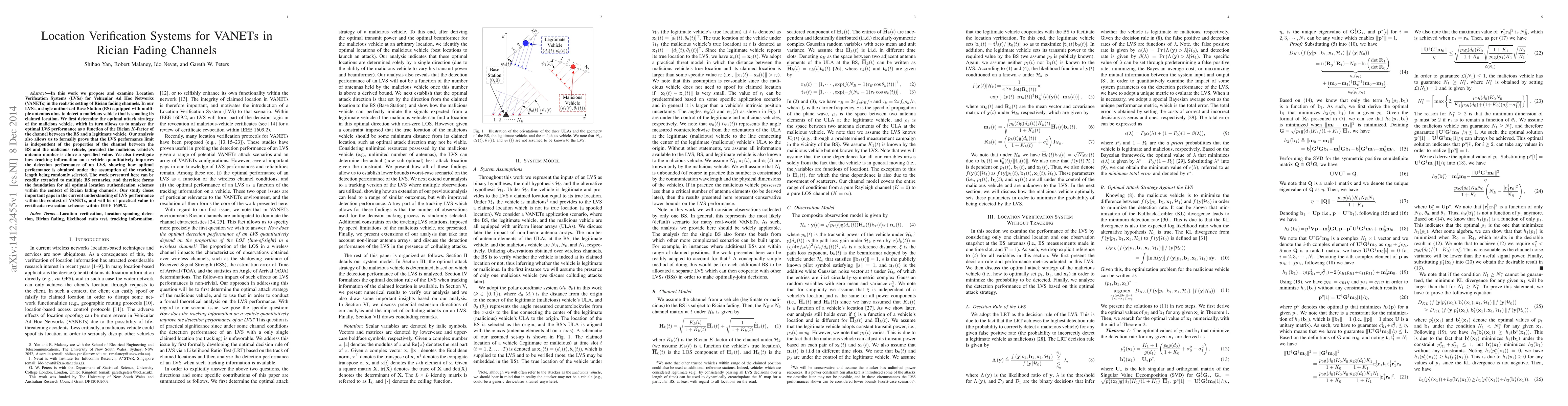 In this work we propose and examine Location Verification Systems (LVSs) for Vehicular Ad Hoc Networks (VANETs) in the realistic setting of Rician fading channels. In our LVSs, a single authorized Base Station (BS) equipped with multiple antennas aims to detect a malicious vehicle that is spoofing its claimed location. We first determine the optimal attack strategy of the malicious vehicle, which in turn allows us to analyze the optimal LVS performance as a function of the Rician $K$-factor of the channel between the BS and a legitimate vehicle. Our analysis also allows us to formally prove that the LVS performance limit is independent of the properties of the channel between the BS and the malicious vehicle, provided the malicious vehicle's antenna number is above a specified value. We also investigate how tracking information on a vehicle quantitatively improves the detection performance of an LVS, showing how optimal performance is obtained under the assumption of the tracking length being randomly selected. The work presented here can be readily extended to multiple BS scenarios, and therefore forms the foundation for all optimal location authentication schemes within the context of Rician fading channels. Our study closes important gaps in the current understanding of LVS performance within the context of VANETs, and will be of practical value to certificate revocation schemes within IEEE 1609.2.