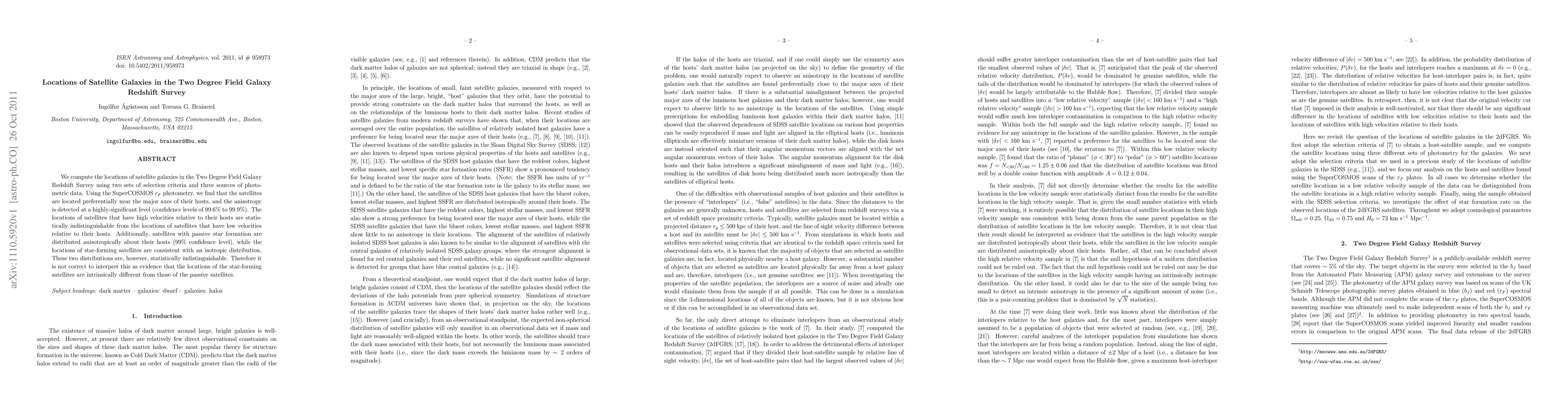 We compute the locations of satellite galaxies in the Two-Degree Field Galaxy Redshift Survey using two sets of selection criteria and three sources of photometric data. Using the SuperCOSMOS r_F photometry, we find that the satellites are located preferentially near the major axes of their hosts, and the anisotropy is detected at a highly-significant level (confidence levels of 99.6% to 99.9%). The locations of satellites that have high velocities relative to their hosts are statistically indistinguishable from the locations of satellites that have low velocities relative to their hosts. Additionally, satellites with passive star formation are distributed anisotropically about their hosts (99% confidence level), while the locations of star-forming satellites are consistent with an isotropic distribution. These two distributions are, however, statistically indistinguishable. Therefore it is not correct to interpret this as evidence that the locations of the star-forming satellites are intrinsically different from those of the passive satellites.
