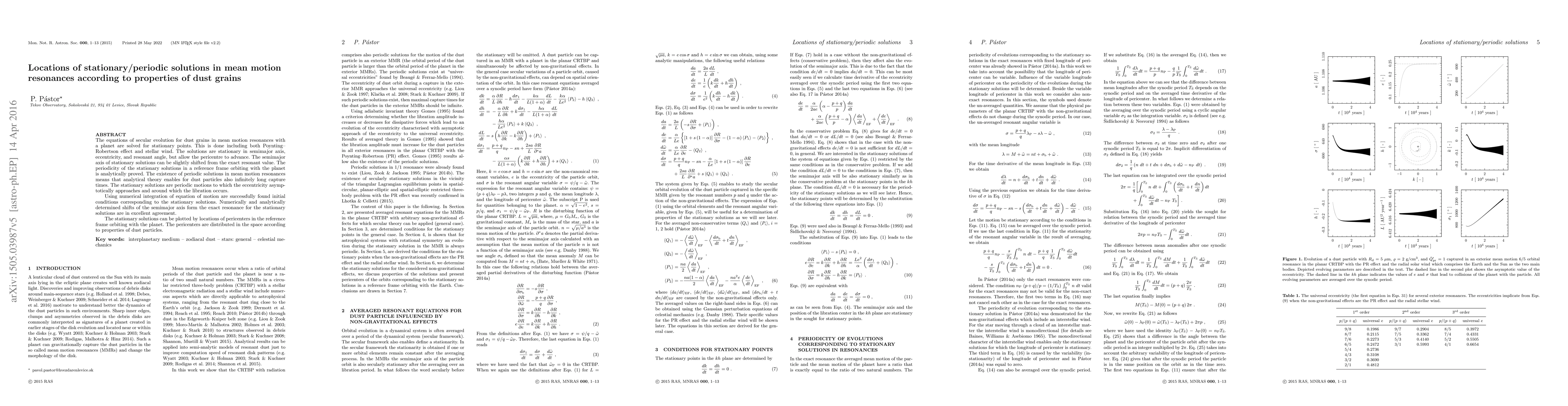 The equations of secular evolution for dust grains in mean motion resonances with a planet are solved for stationary points. This is done including both Poynting-Robertson effect and stellar wind. The solutions are stationary in semimajor axis, eccentricity, and resonant angle, but allow the pericentre to advance. The semimajor axis of stationary solutions can be slightly shifted from the exact resonant value. The periodicity of the stationary solutions in a reference frame orbiting with the planet is analytically proved. The existence of periodic solutions in mean motion resonances means that analytical theory enables for dust particles also infinitely long capture times. The stationary solutions are periodic motions to which the eccentricity asymptotically approaches and around which the libration occurs. Using numerical integration of equation of motion are successfully found initial conditions corresponding to the stationary solutions. Numerically and analytically determined shifts of the semimajor axis form the exact resonance for the stationary solutions are in excellent agreement. The stationary solutions can be plotted by locations of pericenters in the reference frame orbiting with the planet. The pericenters are distributed in the space according to properties of dust particles.