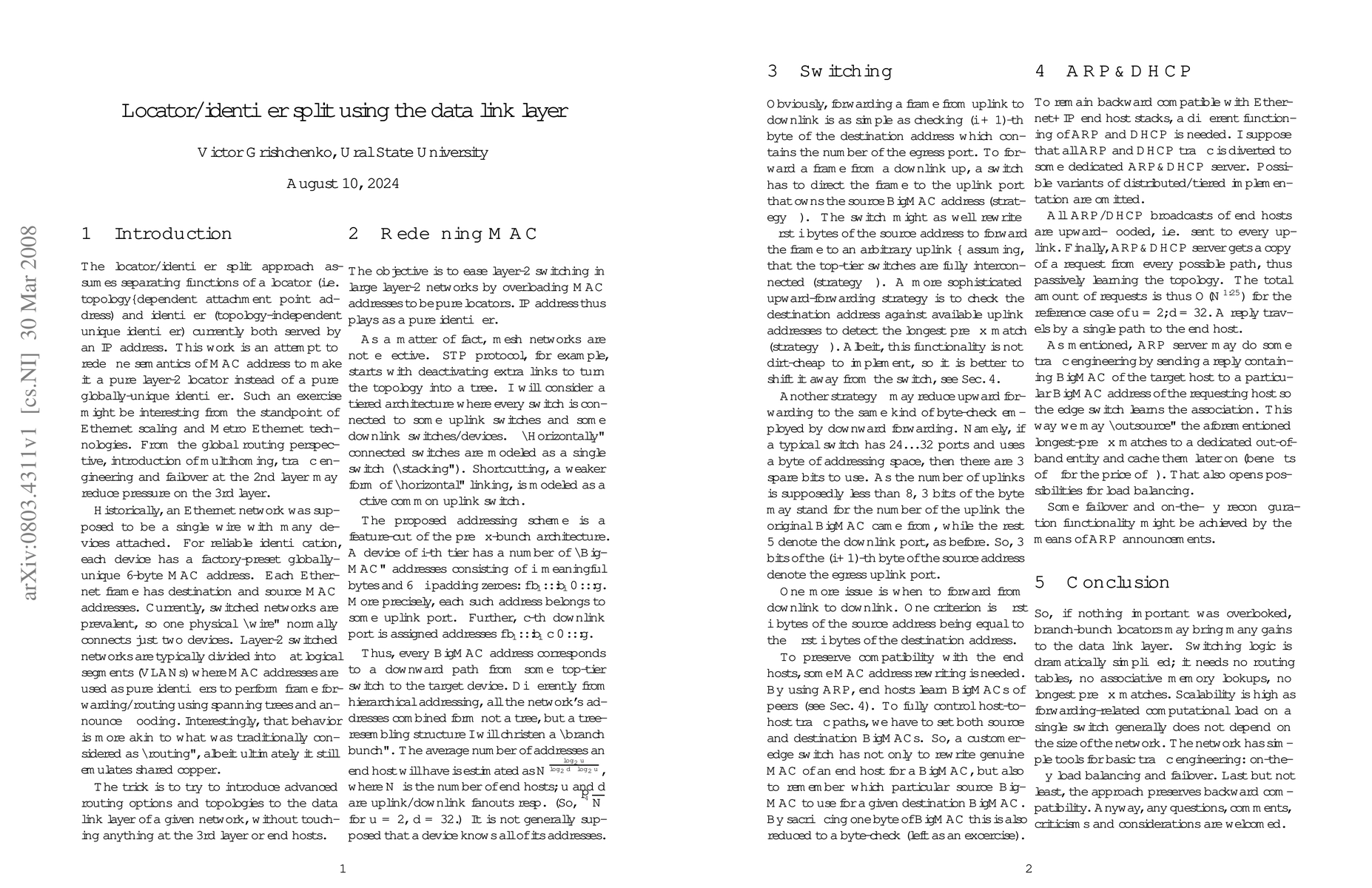 The locator/identifier split approach assumes separating functions of a locator (i.e. topology--dependent attachment point address) and identifier (topology-independent unique identifier) currently both served by an IP address. This work is an attempt to redefine semantics of MAC address to make it a pure layer-2 locator instead of a pure globally-unique identifier. Such an exercise might be interesting from the standpoint of Ethernet scaling and Metro Ethernet technologies. From the global routing perspective, introduction of multihoming, traffic engineering and failover at the 2nd layer may reduce pressure on the 3rd layer.