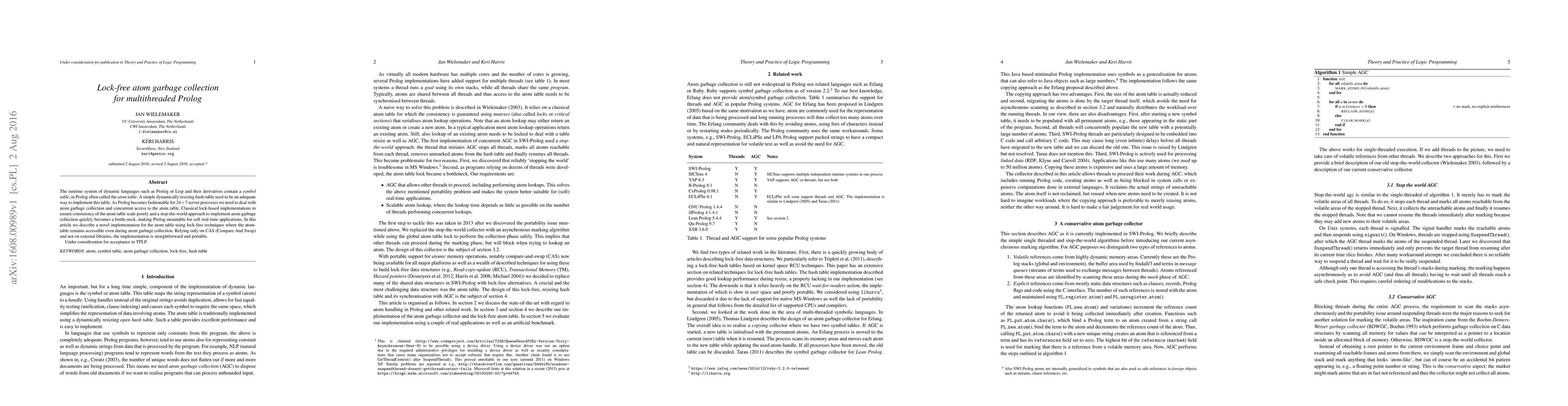 This paper proposes a lock-free garbage collection method for the atom table in multithreaded Prolog, ensuring concurrent access without bottlenecks. The implementation uses CAS operations for consistency, making it efficient and suitable for real-time applications.