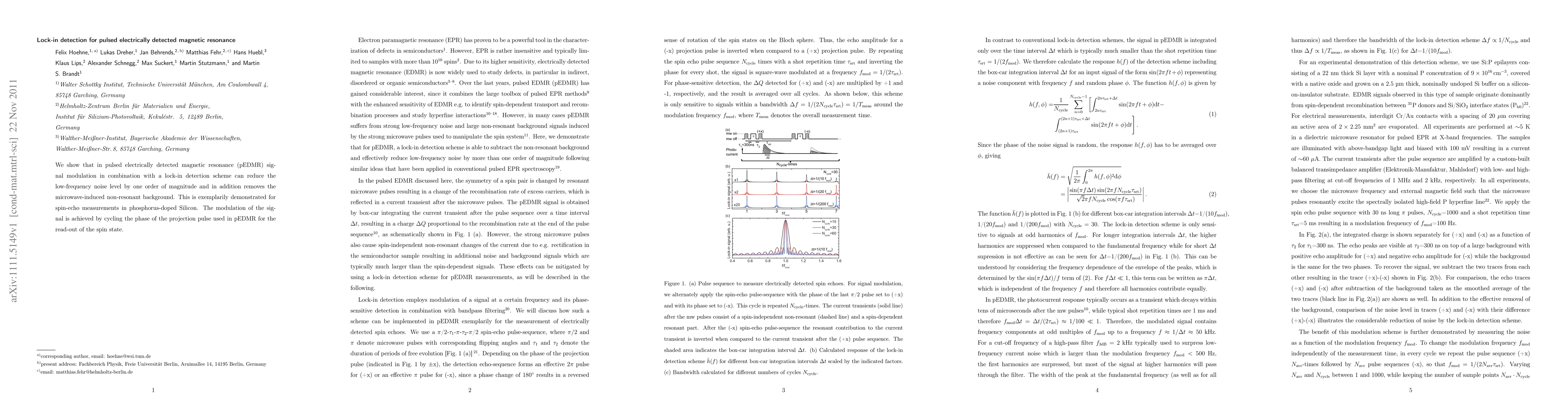 This paper demonstrates that combining pulsed electrically detected magnetic resonance (pEDMR) signal modulation with lock-in detection significantly reduces low-frequency noise and eliminates microwave-induced non-resonant background, as shown in spin-echo measurements in phosphorus-doped silicon. Signal modulation is achieved by cycling the phase of the projection pulse used for spin state readout.