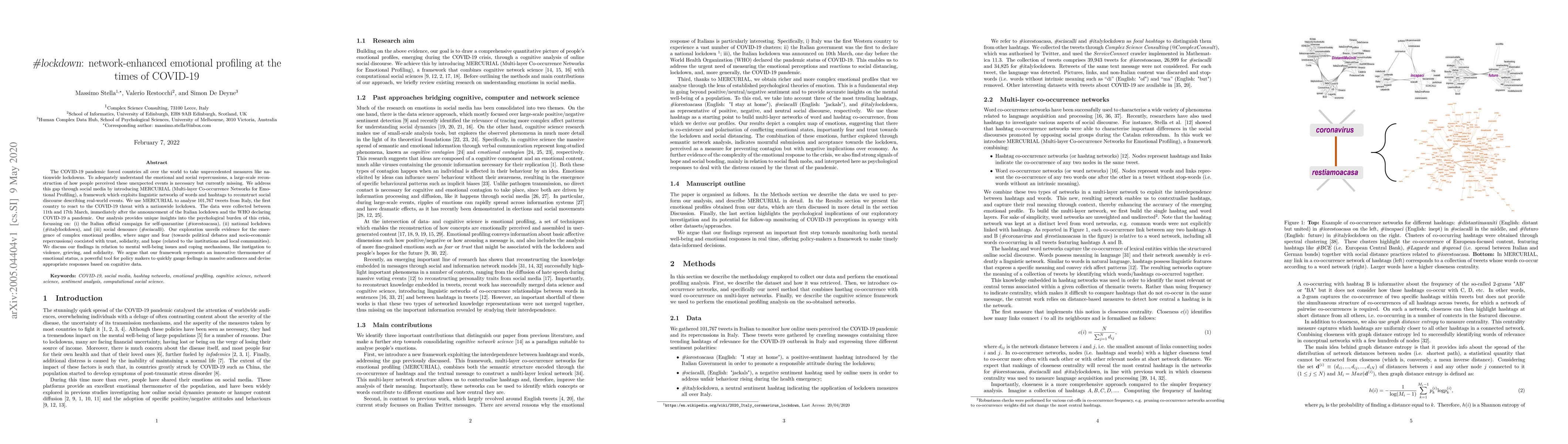 The COVID-19 pandemic forced countries all over the world to take unprecedented measures like nationwide lockdowns. To adequately understand the emotional and social repercussions, a large-scale reconstruction of how people perceived these unexpected events is necessary but currently missing. We address this gap through social media by introducing MERCURIAL (Multi-layer Co-occurrence Networks for Emotional Profiling), a framework which exploits linguistic networks of words and hashtags to reconstruct social discourse describing real-world events. We use MERCURIAL to analyse 101,767 tweets from Italy, the first country to react to the COVID-19 threat with a nationwide lockdown. The data were collected between 11th and 17th March, immediately after the announcement of the Italian lockdown and the WHO declaring COVID-19 a pandemic. Our analysis provides unique insights into the psychological burden of this crisis, focussing on: (i) the Italian official campaign for self-quarantine (#iorestoacasa}), (ii) national lockdown (#italylockdown), and (iii) social denounce (#sciacalli). Our exploration unveils evidence for the emergence of complex emotional profiles, where anger and fear (towards political debates and socio-economic repercussions) coexisted with trust, solidarity, and hope (related to the institutions and local communities). We discuss our findings in relation to mental well-being issues and coping mechanisms, like instigation to violence, grieving, and solidarity. We argue that our framework represents an innovative thermometer of emotional status, a powerful tool for policy makers to quickly gauge feelings in massive audiences and devise appropriate responses based on cognitive data.