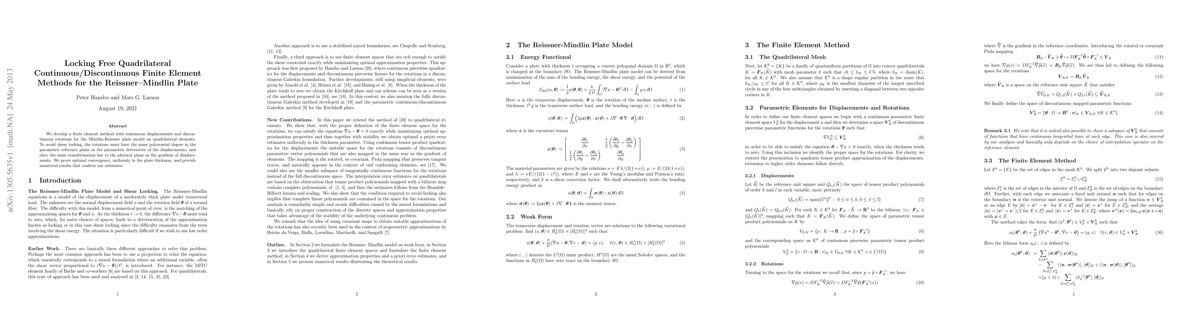 This paper introduces a finite element method for the Reissner-Mindlin plate model using quadrilateral elements with continuous displacements and discontinuous rotations to avoid shear locking. The method ensures optimal convergence and is validated through numerical results.