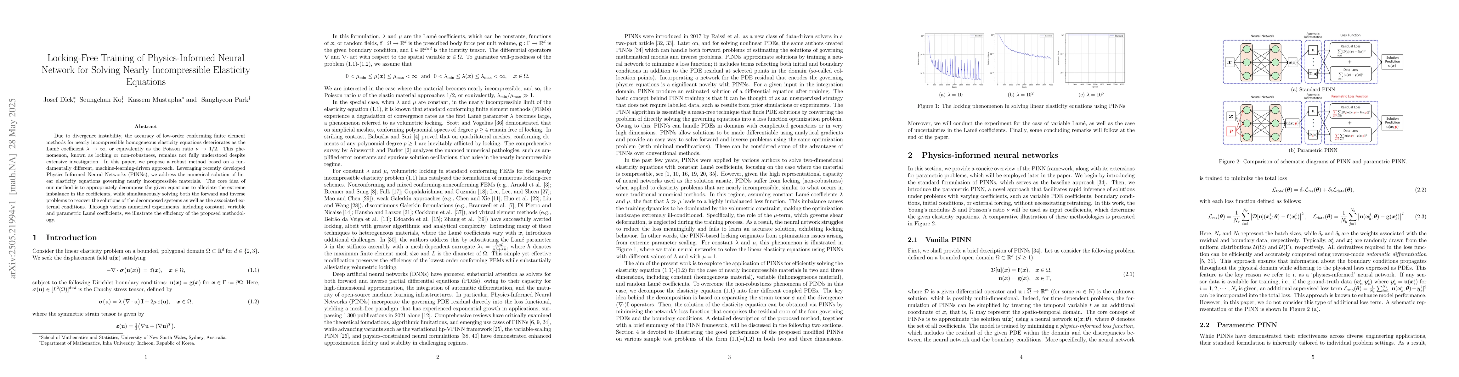 The research proposes a locking-free training method for Physics-Informed Neural Networks (PINNs) to solve nearly incompressible elasticity equations, addressing the divergence instability issue in low-order conforming finite element methods by decomposing the equations and simultaneously solving forward and inverse problems.