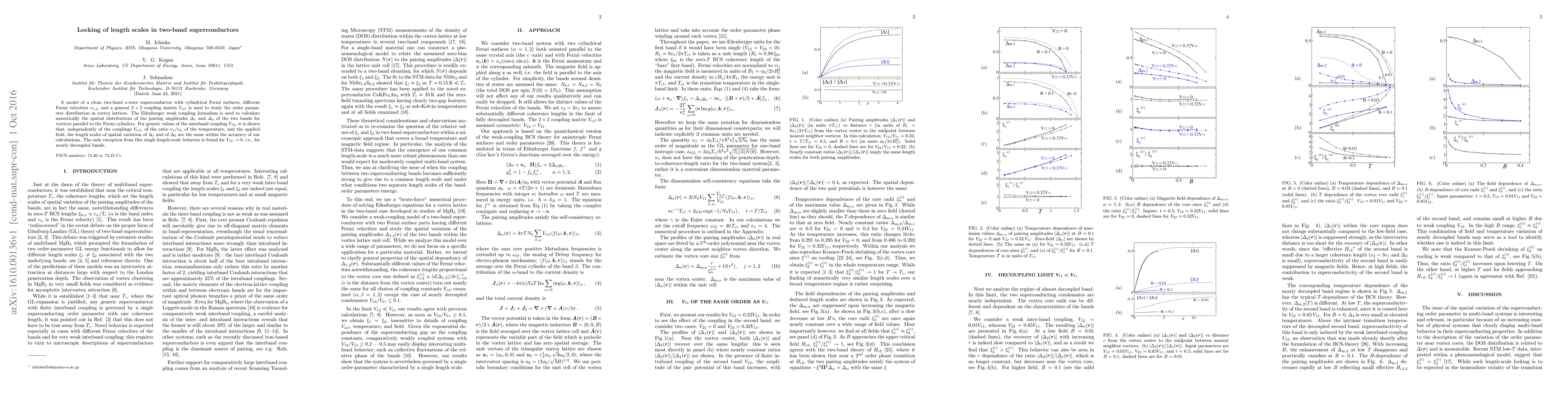 This paper investigates a two-band superconductor model to determine the spatial distribution of pairing amplitudes in vortex lattices. The study reveals that, for most interband coupling values, the length scales of the pairing amplitudes' spatial variation are identical, except for nearly decoupled bands where this uniformity breaks down.