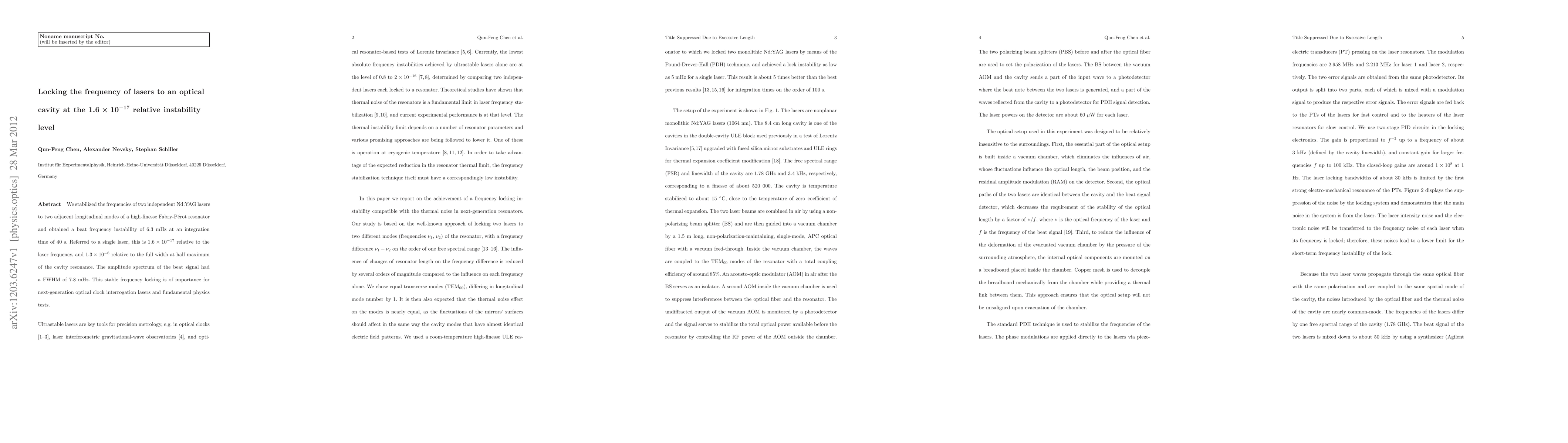 Researchers achieved frequency locking of two lasers to adjacent modes in a high-finesse resonator, with an instability level of $1.6 imes10^{-17}$ relative to the laser frequency.