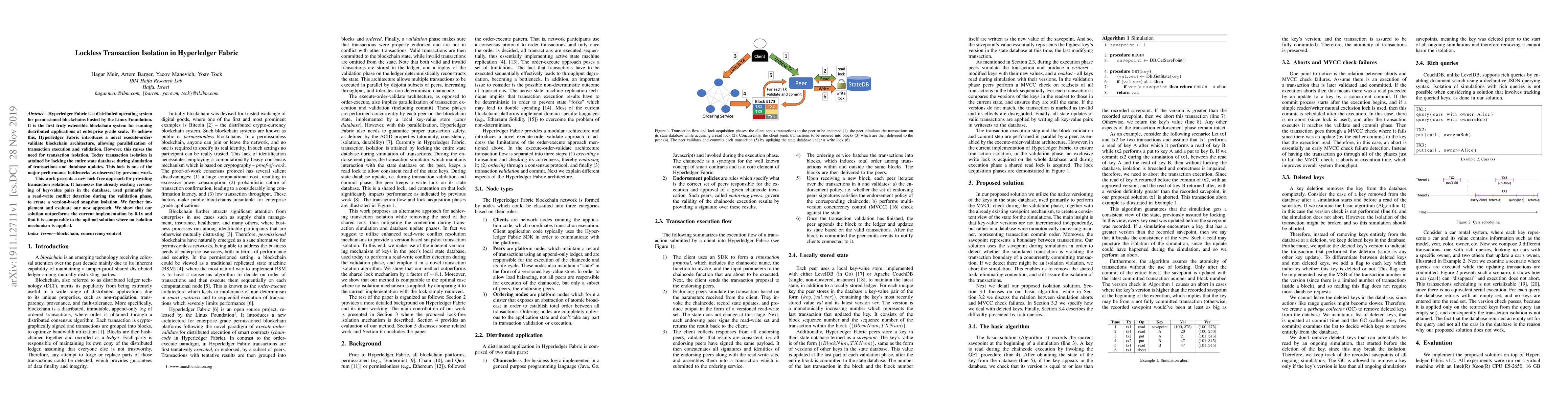 This paper proposes a lock-free approach for transaction isolation in Hyperledger Fabric, leveraging the existing versioning of key-value pairs to implement version-based snapshot isolation. The new method significantly outperforms the traditional locking approach, achieving an 8.1x improvement in performance.