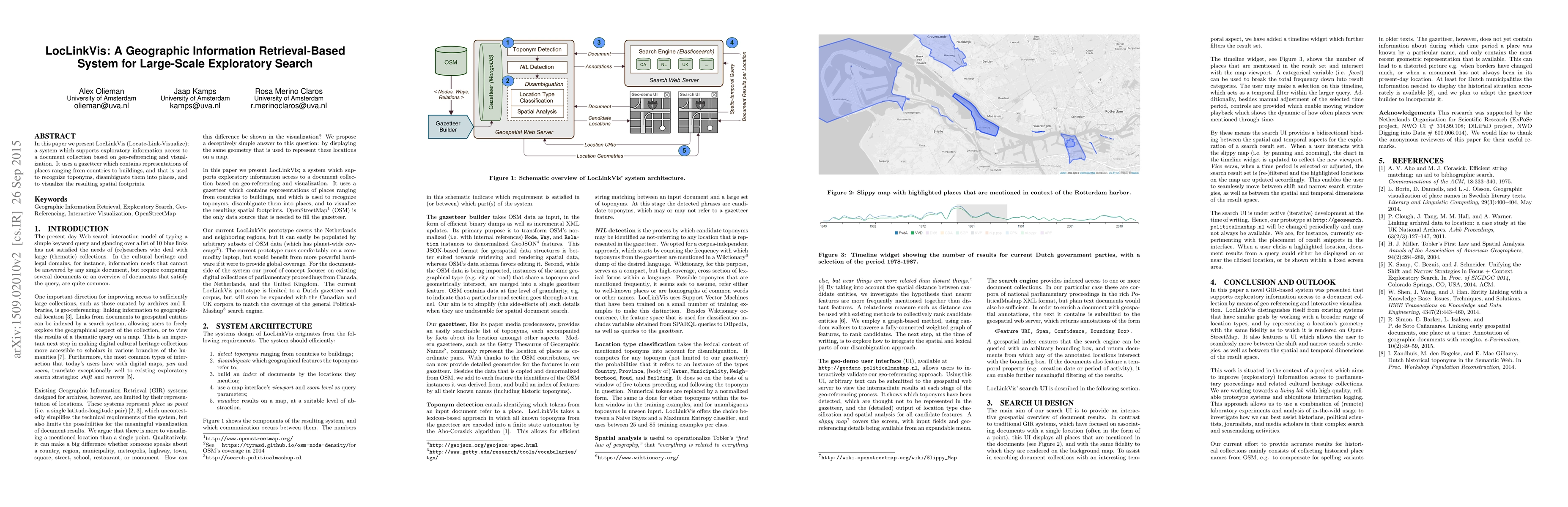In this paper we present LocLinkVis (Locate-Link-Visualize); a system which supports exploratory information access to a document collection based on geo-referencing and visualization. It uses a gazetteer which contains representations of places ranging from countries to buildings, and that is used to recognize toponyms, disambiguate them into places, and to visualize the resulting spatial footprints.