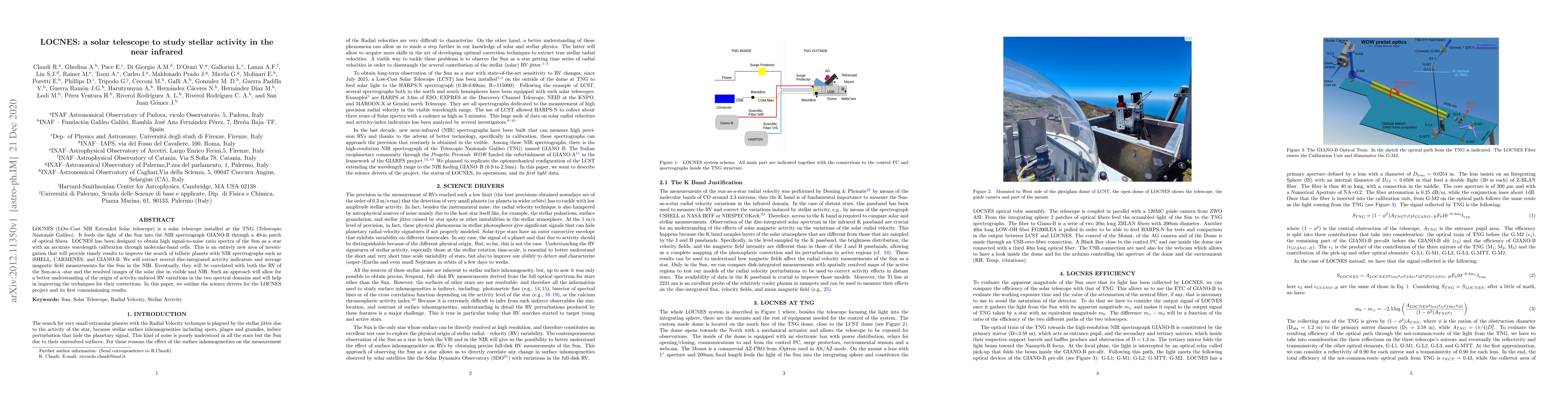 LOCNES (LOw-Cost NIR Extended Solar telescope) is a solar telescope installed at the TNG (Telescopio Nazionale Galileo). It feeds the light of the Sun into the NIR spectrograph GIANO-B through a 40-m patch of optical fibers. LOCNES has been designed to obtain high signal-to-noise ratio spectra of the Sun as a star with an accurate wavelength calibration through molecular-band cells. This is an entirely new area of investigation that will provide timely results to improve the search of telluric planets with NIR spectrographs such as iSHELL, CARMENES, and GIANO-B. We will extract several disc-integrated activity indicators and average magnetic field measurements for the Sun in the NIR. Eventually, they will be correlated with both the RV of the Sun-as-a -star and the resolved images of the solar disc in visible and NIR. Such an approach will allow for a better understanding of the origin of activity-induced RV variations in the two spectral domains and will help in improving the techniques for their corrections. In this paper, we outline the science drivers for the LOCNES project and its first commissioning results.