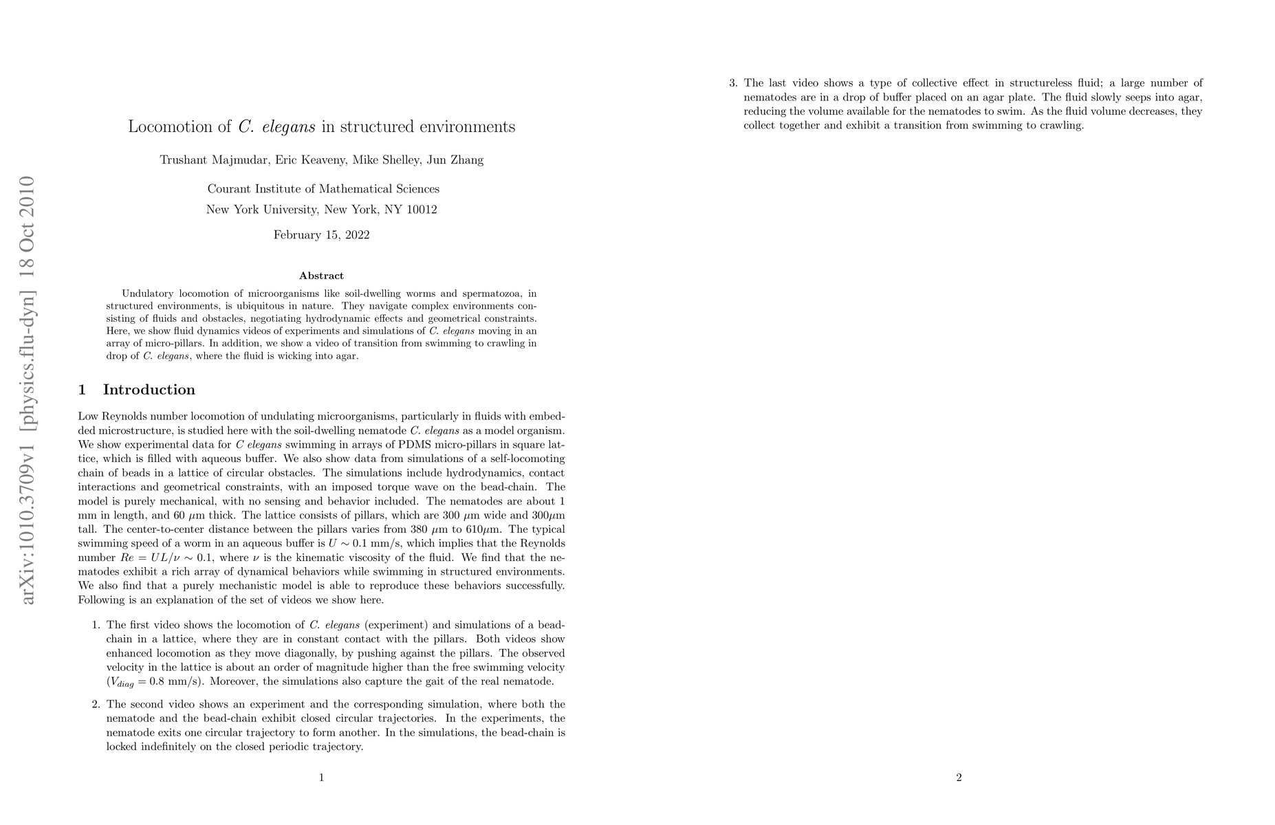 Undulatory locomotion of microorganisms like soil-dwelling worms and spermatozoa, in structured environments, is ubiquitous in nature. They navigate complex environments consisting of fluids and obstacles, negotiating hydrodynamic effects and geometrical constraints. Here, we show fluid dynamics videos of experiments and simulations of {\textit {C. elegans}} moving in an array of micro-pillars. In addition, we show a video of transition from swimming to crawling in drop of {\textit {C. elegans}}, where the fluid is wicking into agar.