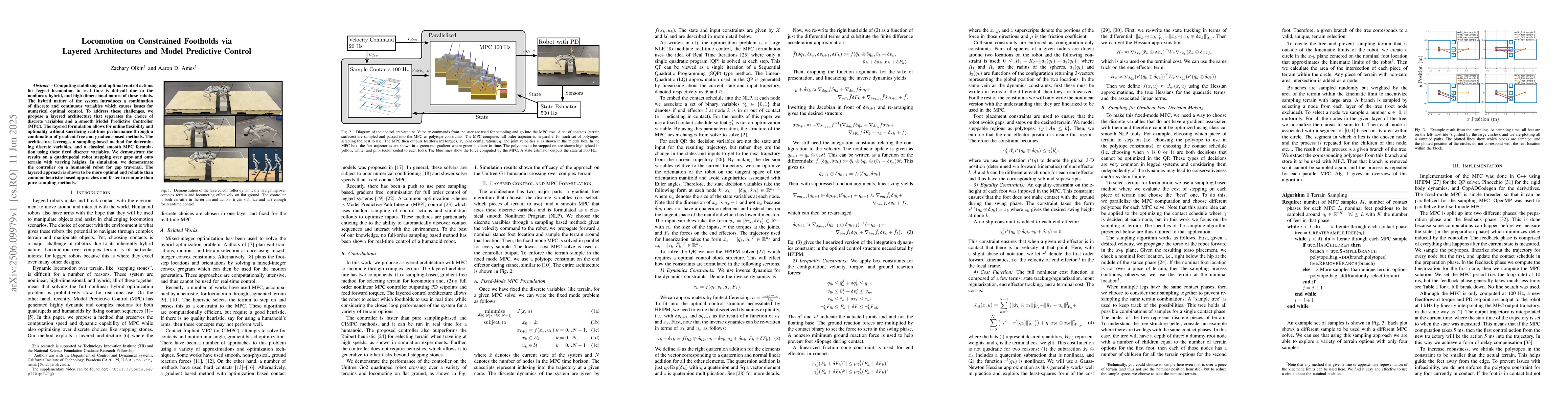 Computing stabilizing and optimal control actions for legged locomotion in real time is difficult due to the nonlinear, hybrid, and high dimensional nature of these robots. The hybrid nature of the system introduces a combination of discrete and continuous variables which causes issues for numerical optimal control. To address these challenges, we propose a layered architecture that separates the choice of discrete variables and a smooth Model Predictive Controller (MPC). The layered formulation allows for online flexibility and optimality without sacrificing real-time performance through a combination of gradient-free and gradient-based methods. The architecture leverages a sampling-based method for determining discrete variables, and a classical smooth MPC formulation using these fixed discrete variables. We demonstrate the results on a quadrupedal robot stepping over gaps and onto terrain with varying heights. In simulation, we demonstrate the controller on a humanoid robot for gap traversal. The layered approach is shown to be more optimal and reliable than common heuristic-based approaches and faster to compute than pure sampling methods.