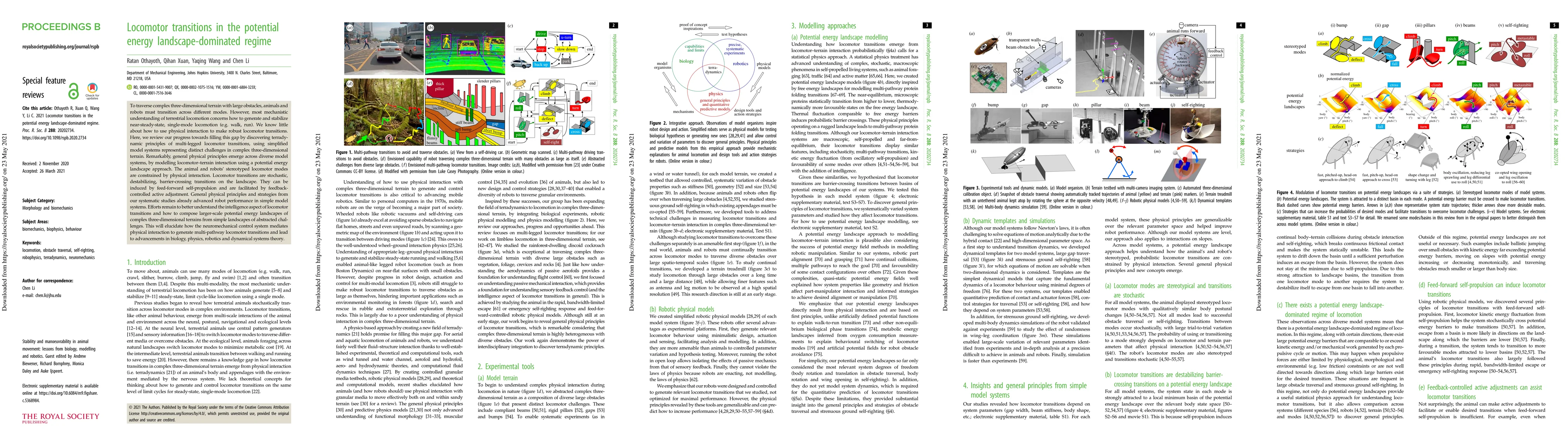 To traverse complex three-dimensional terrainwith large obstacles, animals and robots must transition across different modes. However, the most mechanistic understanding of terrestrial locomotion concerns how to generate and stabilize near-steady-state, single-mode locomotion (e.g. walk, run). We know little about how to use physical interaction to make robust locomotor transitions. Here, we review our progress towards filling this gap by discovering terradynamic principles of multi-legged locomotor transitions, using simplified model systems representing distinct challenges in complex three-dimensional terrain. Remarkably, general physical principles emerge across diverse model systems, by modelling locomotor-terrain interaction using a potential energy landscape approach. The animal and robots' stereotyped locomotor modes are constrained by physical interaction. Locomotor transitions are stochastic, destabilizing, barrier-crossing transitions on the landscape. They can be induced by feed-forward self-propulsion and are facilitated by feedbackcontrolled active adjustment. General physical principles and strategies from our systematic studies already advanced robot performance in simple model systems. Efforts remain to better understand the intelligence aspect of locomotor transitions and how to compose larger-scale potential energy landscapes of complex three-dimensional terrains from simple landscapes of abstracted challenges. This will elucidate how the neuromechanical control system mediates physical interaction to generate multi-pathway locomotor transitions and lead to advancements in biology, physics, robotics and dynamical systems theory.