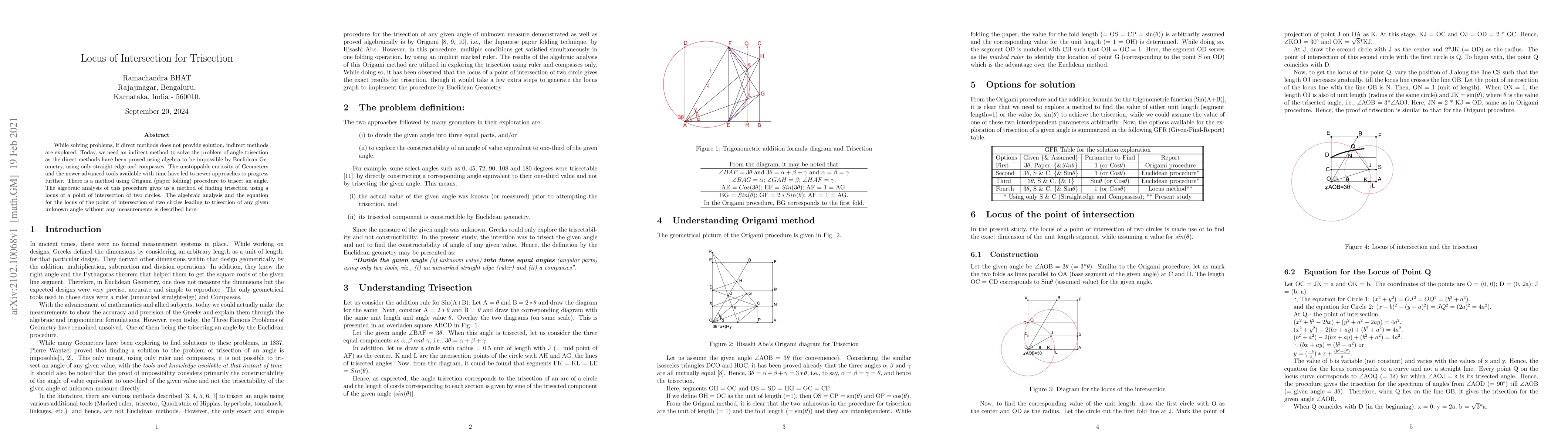 Trisecting an angle has been proved to be impossible by Euclidean Geometry, using only straight edge and compass. However, there is a method using Origami (paper folding) procedure to trisect an angle. The algebraic analysis of the same gives us a method of finding trisection using a locus of a point of intersection of two circles. The algebraic analysis and the equation for the locus of the point of intersection of two circles leading to trisection without any measurements is described here. The proof of trisection is exactly same as that of the Origami procedure.