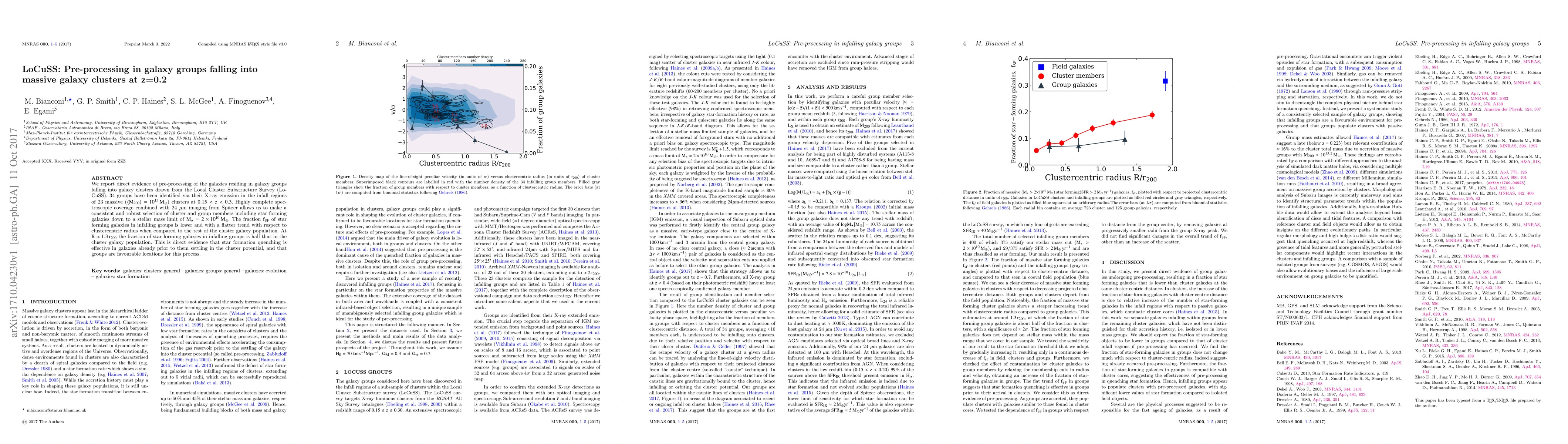 The LoCuSS survey identifies galaxy groups falling into massive clusters at z=0.2, showing lower star formation rates in these groups compared to the cluster population, indicating pre-processing and quenching of star formation before galaxies enter the cluster.