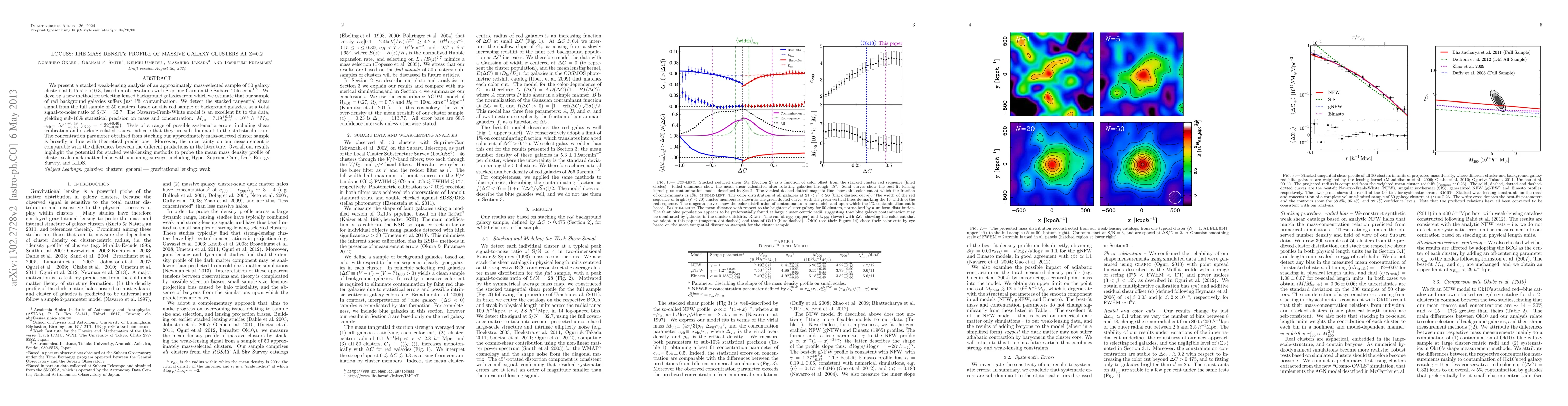 This study uses weak-lensing analysis on 50 massive galaxy clusters at z=0.2, finding precise measurements of their mass and concentration using Subaru Telescope data. The Navarro-Frenk-White model accurately describes the data, indicating the method's potential for future surveys like Hyper-Suprime-Cam, Dark Energy Survey, and KIDS to study dark matter halos.