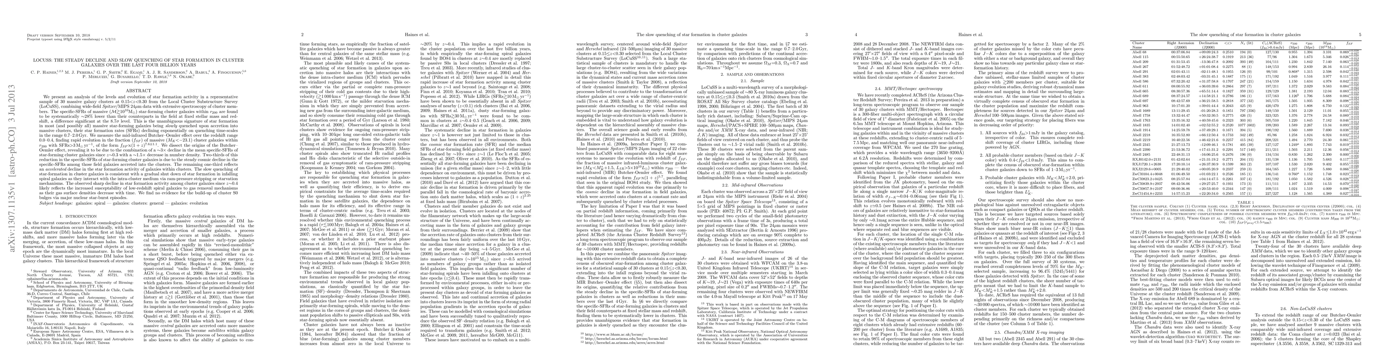 The LoCuSS study reveals a significant decline in star formation activity in massive cluster galaxies over the last four billion years, showing that star-forming galaxies in clusters are systematically quenched, with their star formation rates decreasing exponentially over 0.7-2.0 Gyr. The mid-infrared Butcher-Oemler effect indicates a rapid evolution in the fraction of star-forming cluster galaxies, primarily due to a decline in their specific star formation rates and a decrease in their number density.