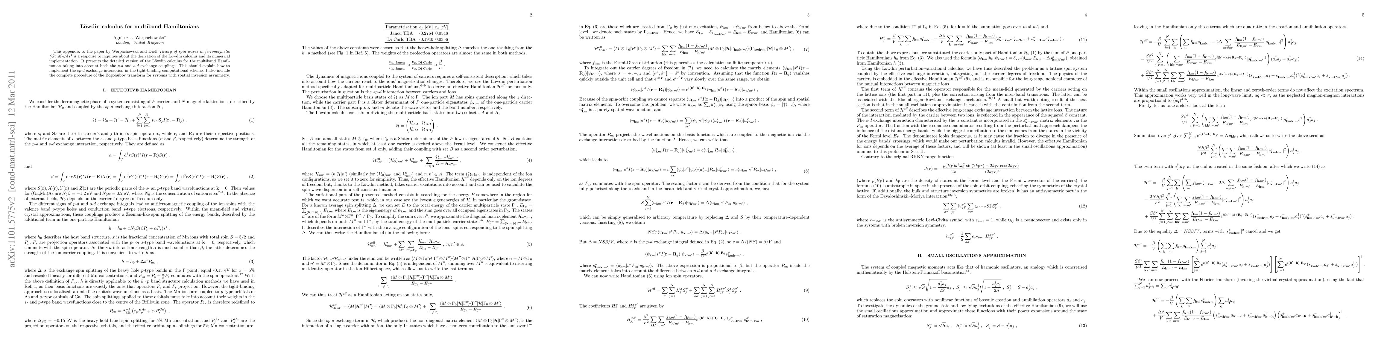 This appendix to the paper by Werpachowska and Dietl "Theory of spin waves in ferromagnetic (Ga,Mn)As" (DOI: 10.1103/PhysRevB.82.085204) is a response to inquiries about the derivation of the Loewdin calculus and its numerical implementation. It presents the detailed version of the Loewdin calculus for the multiband Hamiltonian taking into account both the p-d and s-d exchange couplings. This should explain how to implement the sp-d exchange interaction in the tight-binding computational scheme. I also include the complete procedure of the Bogoliubov transform for systems with spatial inversion asymmetry.