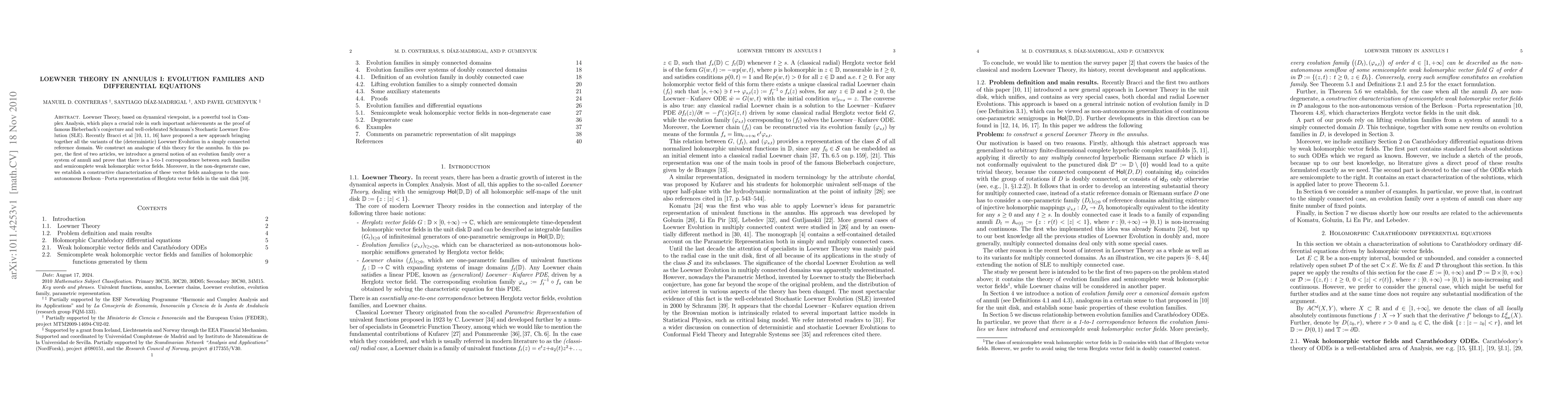 Loewner Theory, based on dynamical viewpoint, is a powerful tool in Complex Analysis, which plays a crucial role in such important achievements as the proof of famous Bieberbach's conjecture and well-celebrated Schramm's Stochastic Loewner Evolution (SLE). Recently Bracci et al [Bracci et al, to appear in J. Reine Angew. Math. Available on ArXiv 0807.1594; Bracci et al, Math. Ann. 344(2009), 947--962; Contreras et al, Revista Matematica Iberoamericana 26(2010), 975--1012] have proposed a new approach bringing together all the variants of the (deterministic) Loewner Evolution in a simply connected reference domain. We construct an analogue of this theory for the annulus. In this paper, the first of two articles, we introduce a general notion of an evolution family over a system of annuli and prove that there is a 1-to-1 correspondence between such families and semicomplete weak holomorphic vector fields. Moreover, in the non-degenerate case, we establish a constructive characterization of these vector fields analogous to the non-autonomous Berkson - Porta representation of Herglotz vector fields in the unit disk [Bracci et al, to appear in J. Reine Angew. Math. Available on ArXiv 0807.1594].