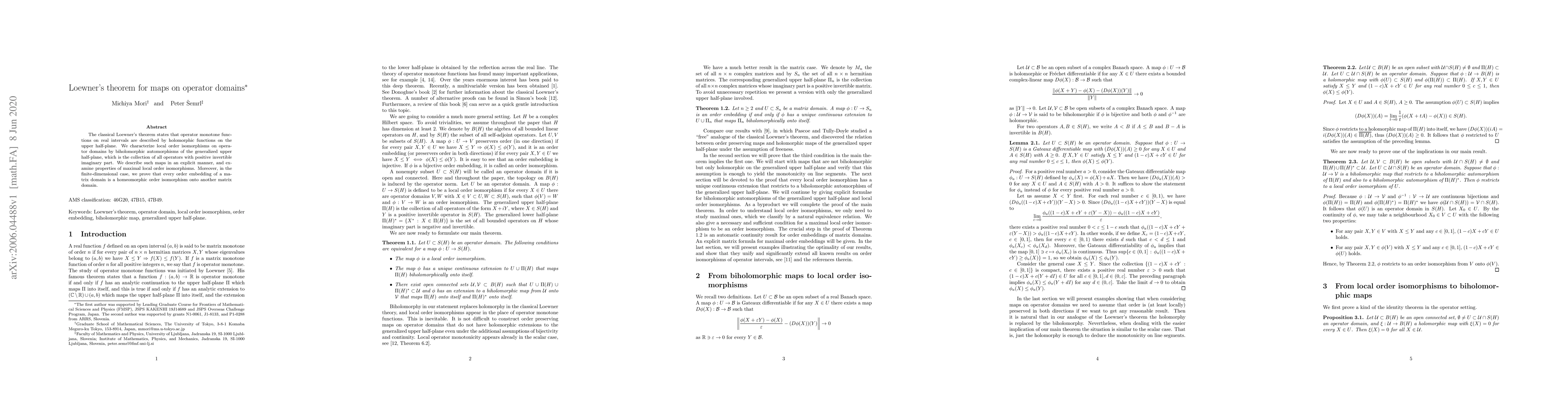 Loewner's theorem is extended to operator domains, where local order isomorphisms are characterized by biholomorphic automorphisms of the generalized upper half-plane. The study also proves that every finite-dimensional order embedding between matrix domains is a homeomorphic order isomorphism.