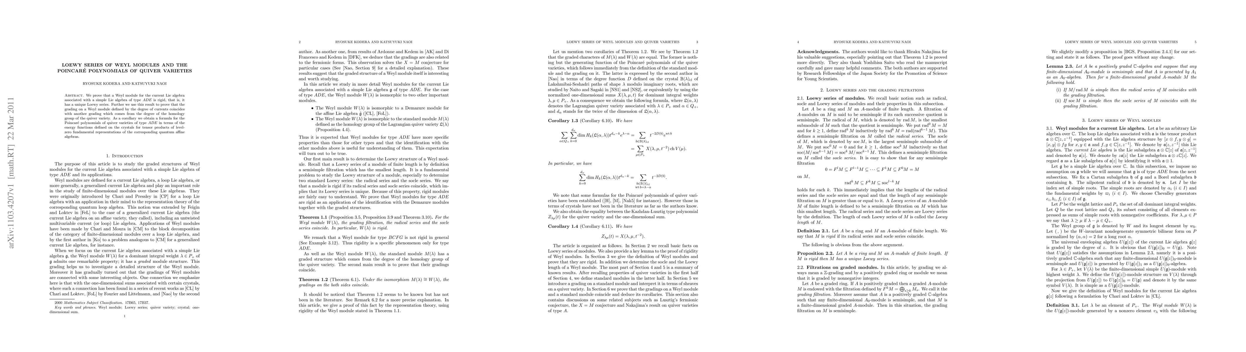 Summary: This paper demonstrates that Weyl modules for type $ADE$ Lie algebras have a unique Loewy series, linking this rigidity to homology degrees in quiver varieties. Consequently, it derives a formula for the Poincaré polynomials of these varieties using energy functions from quantum affine algebras.