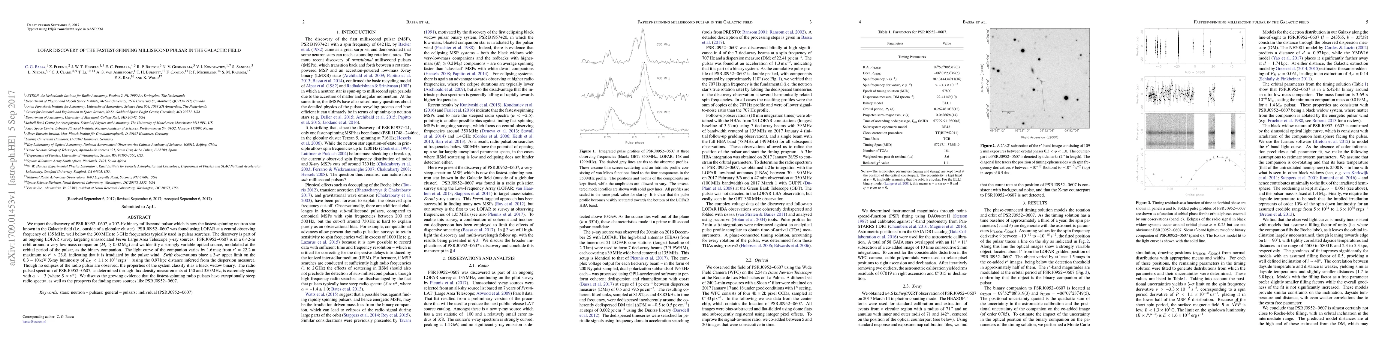 The LOFAR survey discovered PSR J0952$-$0607, the fastest-spinning millisecond pulsar in the Galactic field, with a rotation frequency of 707 Hz. This pulsar is in a 6.42-hr orbit around a low-mass companion, classified as a black widow binary due to its variable optical source.