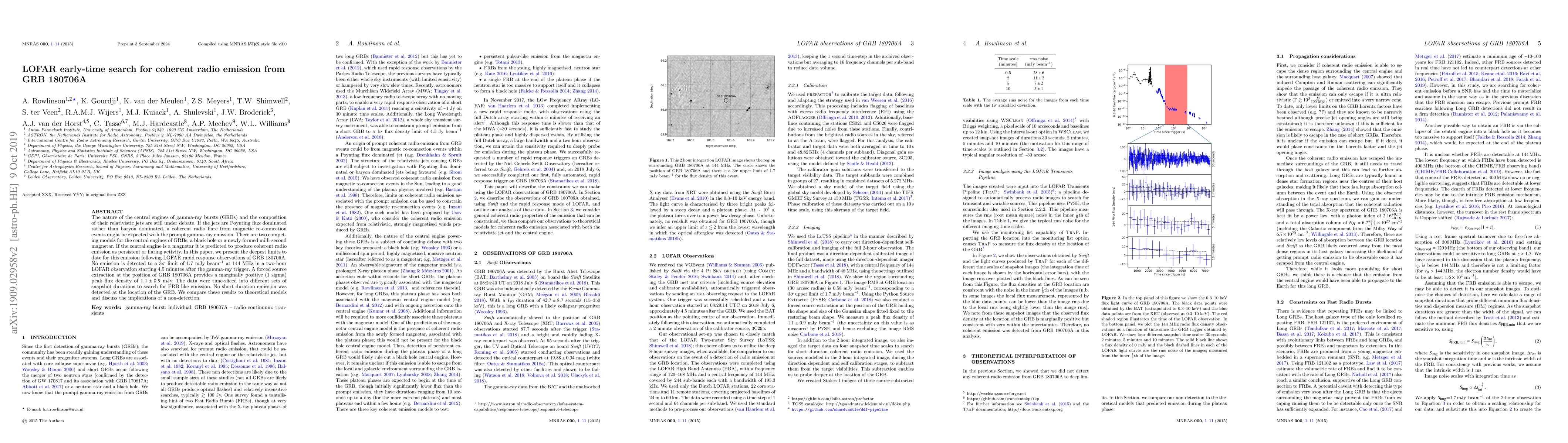 The nature of the central engines of gamma-ray bursts (GRBs) and the composition of their relativistic jets are still under debate. If the jets are Poynting flux dominated rather than baryon dominated, a coherent radio flare from magnetic re-connection events might be expected with the prompt gamma-ray emission. There are two competing models for the central engines of GRBs; a black hole or a newly formed milli-second magnetar. If the central engine is a magnetar it is predicted to produce coherent radio emission as persistent or flaring activity. In this paper, we present the deepest limits to date for this emission following LOFAR rapid response observations of GRB 180706A. No emission is detected to a 3$\sigma$ limit of 1.7 mJy beam$^{-1}$ at 144 MHz in a two-hour LOFAR observation starting 4.5 minutes after the gamma-ray trigger. A forced source extraction at the position of GRB 180706A provides a marginally positive (1 sigma) peak flux density of $1.1 \pm 0.9$ mJy. The data were time-sliced into different sets of snapshot durations to search for FRB like emission. No short duration emission was detected at the location of the GRB. We compare these results to theoretical models and discuss the implications of a non-detection.