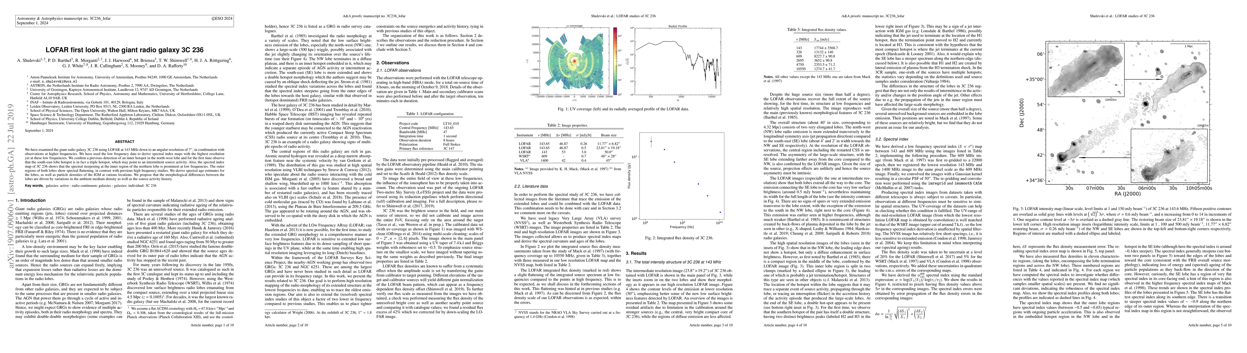 Scientists used LOFAR to study the giant radio galaxy 3C 236, discovering a triple hotspot in the south-east lobe that may indicate intermittent source activity. The research also reveals differences in spectral steepening and flattening across different regions of the lobes.