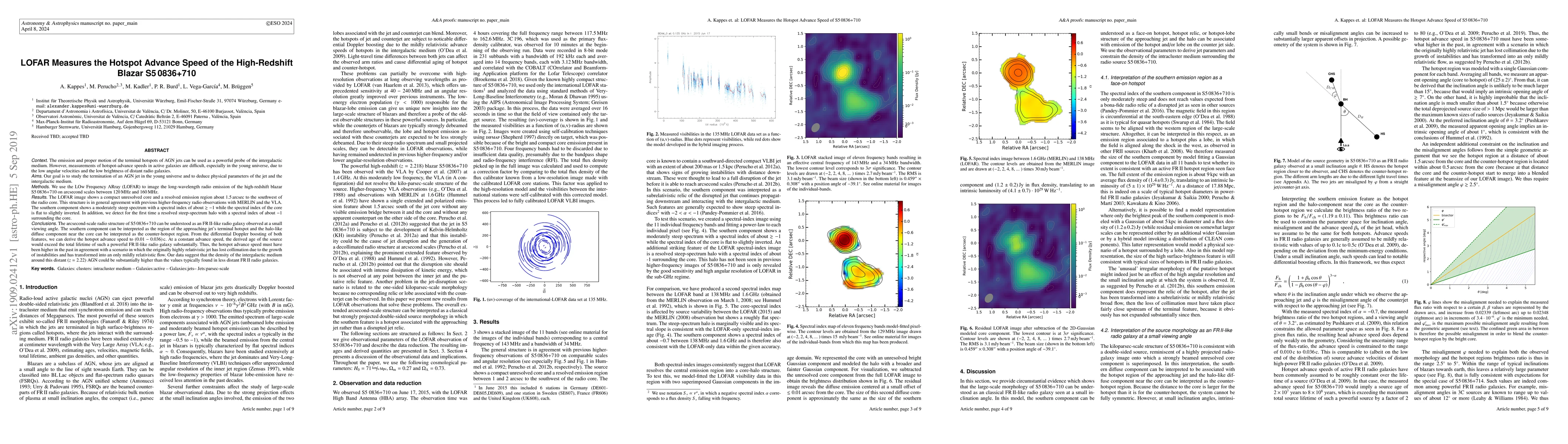 LOFAR imaging of the high-redshift blazar S5 0836+710 reveals a compact core and a southern emission region interpreted as the approaching jet's terminal hotspot, allowing the derivation of a hotspot advance speed of $(0.01-0.036)$ c, suggesting a past higher speed and a denser intergalactic medium than typical.