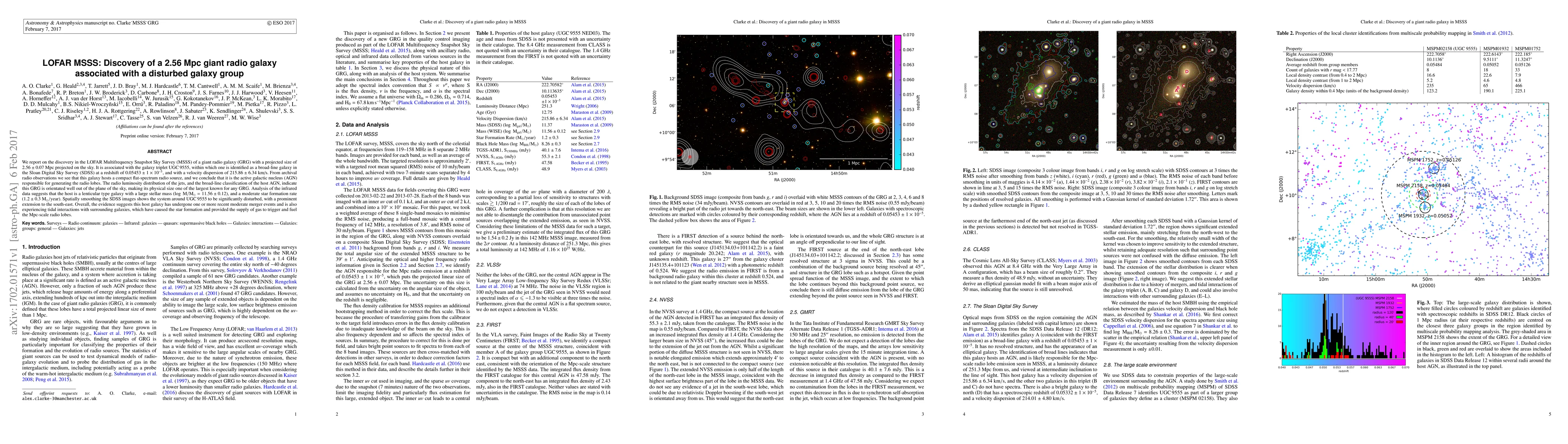 We report on the discovery in the LOFAR Multifrequency Snapshot Sky Survey (MSSS) of a giant radio galaxy (GRG) with a projected size of $2.56 \pm 0.07$ Mpc projected on the sky. It is associated with the galaxy triplet UGC 9555, within which one is identified as a broad-line galaxy in the Sloan Digital Sky Survey (SDSS) at a redshift of $0.05453 \pm 1 \times 10^{-5} $, and with a velocity dispersion of $215.86 \pm 6.34$ km/s. From archival radio observations we see that this galaxy hosts a compact flat-spectrum radio source, and we conclude that it is the active galactic nucleus (AGN) responsible for generating the radio lobes. The radio luminosity distribution of the jets, and the broad-line classification of the host AGN, indicate this GRG is orientated well out of the plane of the sky, making its physical size one of the largest known for any GRG. Analysis of the infrared data suggests that the host is a lenticular type galaxy with a large stellar mass ($\log~\mathrm{M}/\mathrm{M}_\odot = 11.56 \pm 0.12$), and a moderate star formation rate ($1.2 \pm 0.3~\mathrm{M}_\odot/\mathrm{year}$). Spatially smoothing the SDSS images shows the system around UGC 9555 to be significantly disturbed, with a prominent extension to the south-east. Overall, the evidence suggests this host galaxy has undergone one or more recent moderate merger events and is also experiencing tidal interactions with surrounding galaxies, which have caused the star formation and provided the supply of gas to trigger and fuel the Mpc-scale radio lobes.