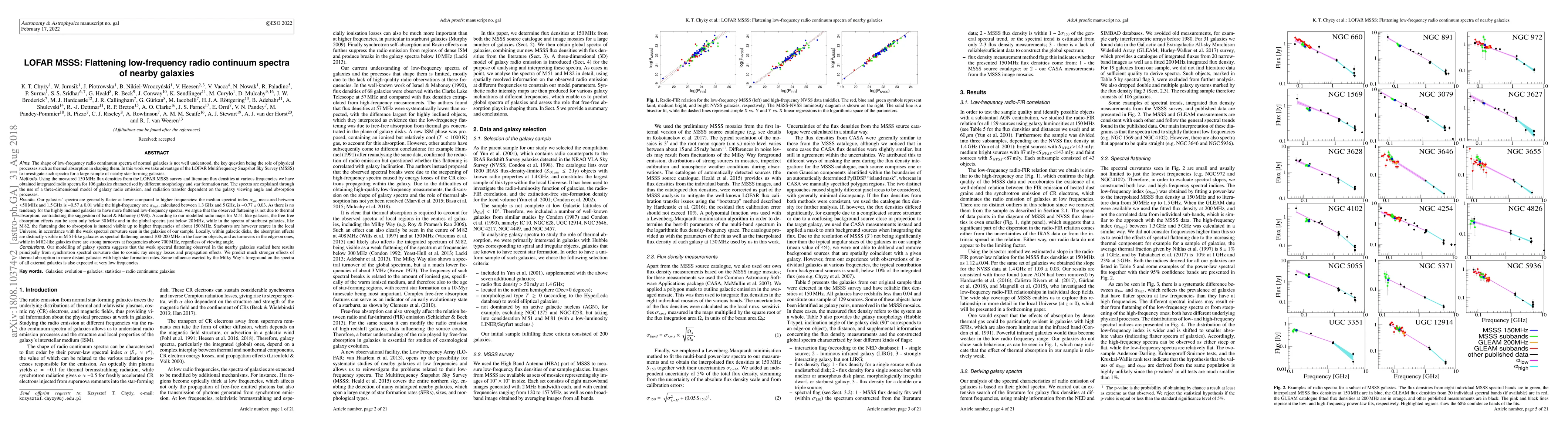 This study uses LOFAR MSSS data to analyze low-frequency radio spectra of nearby star-forming galaxies, revealing that spectral flattening is not due to thermal absorption but rather synchrotron spectral curvature from cosmic ray effects. The findings suggest different absorption behaviors in M51-like versus M82-like galaxies.