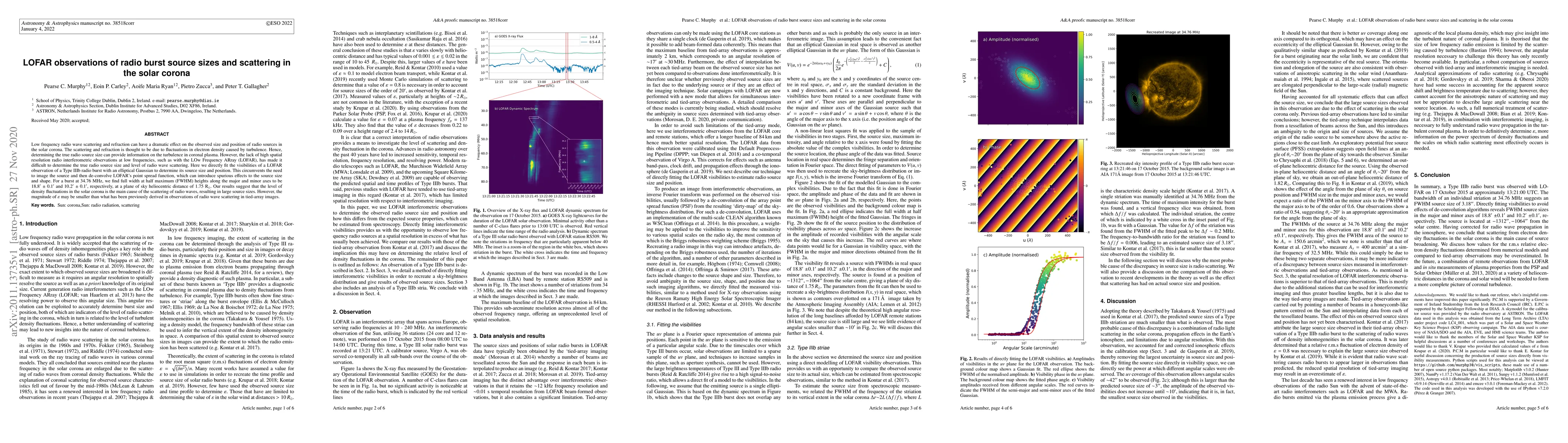 Low frequency radio wave scattering and refraction can have a dramatic effect on the observed size and position of radio sources in the solar corona. The scattering and refraction is thought to be due to fluctuations in electron density caused by turbulence. Hence, determining the true radio source size can provide information on the turbulence in coronal plasma. However, the lack of high spatial resolution radio interferometric observations at low frequencies, such as with the LOw Frequency ARray (LOFAR), has made it difficult to determine the true radio source size and level of radio wave scattering. Here we directly fit the visibilities of a LOFAR observation of a Type IIIb radio burst with an elliptical Gaussian to determine its source size and position. This circumvents the need to image the source and then de-convolve LOFAR's point spread function, which can introduce spurious effects to the source size and shape. For a burst at 34.76 MHz, we find full width at half maximum (FWHM) heights along the major and minor axes to be $18.8^\prime$ $\pm~0.1^\prime$ and $10.2^\prime$ $\pm~0.1^\prime$, respectively, at a plane of sky heliocentric distance of 1.75 R$_\odot$. Our results suggest that the level of density fluctuations in the solar corona is the main cause of the scattering of radio waves, resulting in large source sizes. However, the magnitude of $\varepsilon$ may be smaller than what has been previously derived in observations of radio wave scattering in tied-array images.