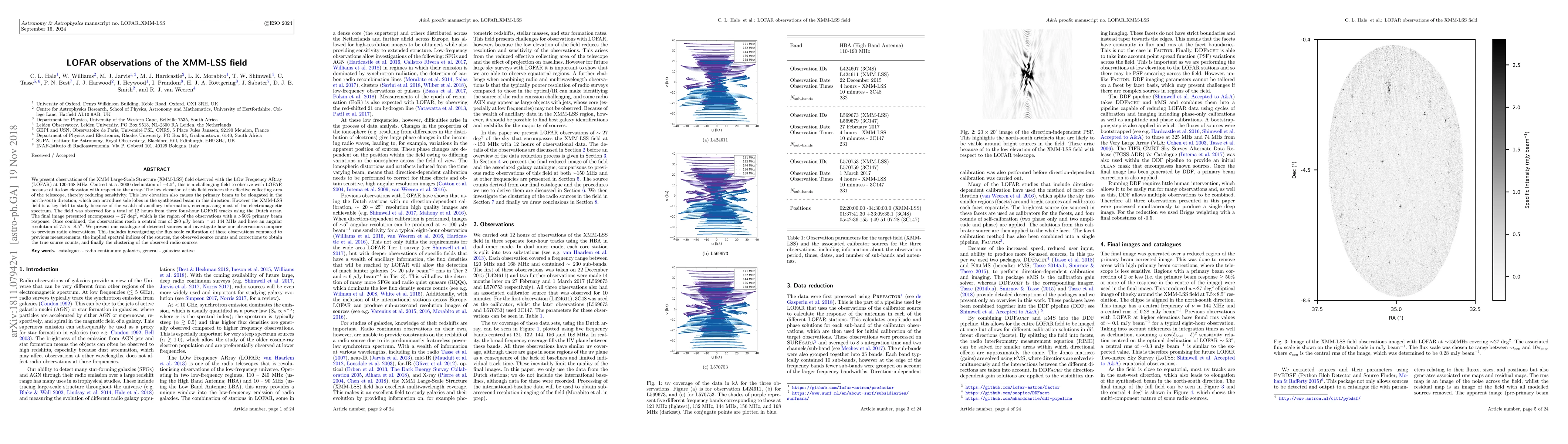 This study utilizes LOFAR observations at 120-168 MHz of the XMM-LSS field, overcoming low elevation challenges to achieve a central rms of 280 $mu$Jy beam$^{-1}$ and angular resolution of $7.5 imes 8.5$''. A catalog of detected sources is presented, comparing these observations to previous radio data, assessing flux scale calibration, spectral indices, source counts, and radio source clustering.