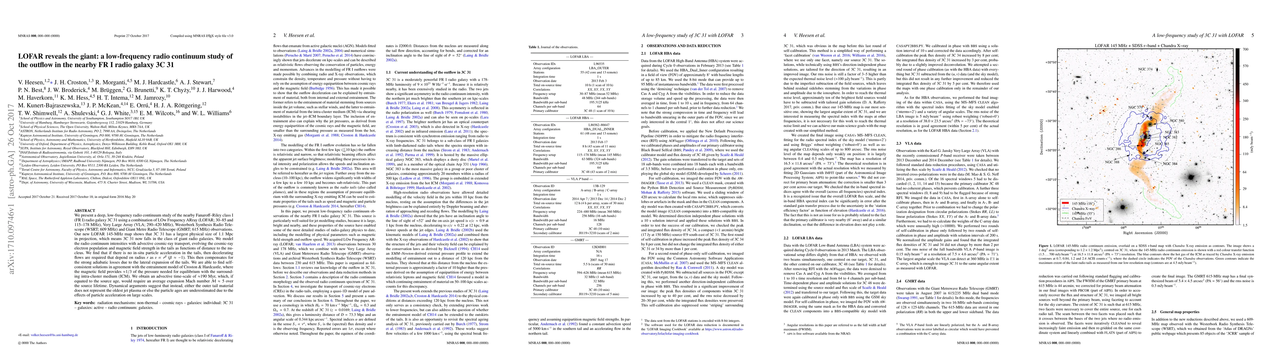 We present a deep, low-frequency radio continuum study of the nearby Fanaroff--Riley class I (FR I) radio galaxy 3C 31 using a combination of LOw Frequency ARray (LOFAR; 30--85 and 115--178 MHz), Very Large Array (VLA; 290--420 MHz), Westerbork Synthesis Radio Telescope (WSRT; 609 MHz) and Giant Metre Radio Telescope (GMRT; 615 MHz) observations. Our new LOFAR 145-MHz map shows that 3C 31 has a largest physical size of $1.1$ Mpc in projection, which means 3C 31 now falls in the class of giant radio galaxies. We model the radio continuum intensities with advective cosmic-ray transport, evolving the cosmic-ray electron population and magnetic field strength in the tails as functions of distance to the nucleus. We find that if there is no in-situ particle acceleration in the tails, then decelerating flows are required that depend on radius $r$ as $v\propto r^{\beta}$ ($\beta\approx -1$). This then compensates for the strong adiabatic losses due to the lateral expansion of the tails. We are able to find self-consistent solutions in agreement with the entrainment model of Croston & Hardcastle, where the magnetic field provides $\approx$$1/3$ of the pressure needed for equilibrium with the surrounding intra-cluster medium (ICM). We obtain an advective time-scale of $\approx$$190$ Myr, which, if equated to the source age, would require an average expansion Mach number ${\cal M} \approx 5$ over the source lifetime. Dynamical arguments suggest that instead, either the outer tail material does not represent the oldest jet plasma or else the particle ages are underestimated due to the effects of particle acceleration on large scales.