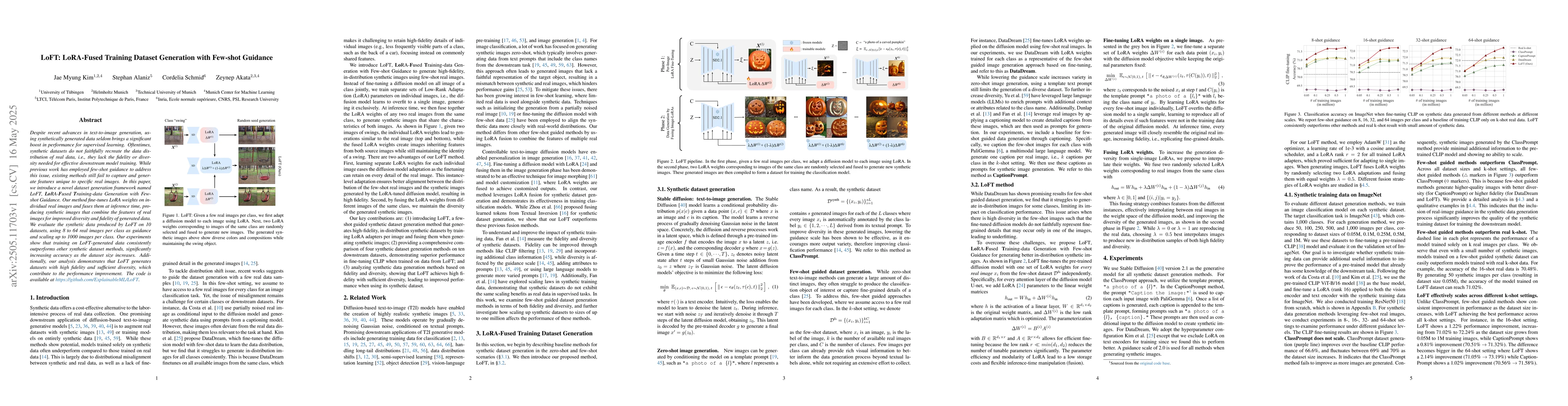 Despite recent advances in text-to-image generation, using synthetically generated data seldom brings a significant boost in performance for supervised learning. Oftentimes, synthetic datasets do not faithfully recreate the data distribution of real data, i.e., they lack the fidelity or diversity needed for effective downstream model training. While previous work has employed few-shot guidance to address this issue, existing methods still fail to capture and generate features unique to specific real images. In this paper, we introduce a novel dataset generation framework named LoFT, LoRA-Fused Training-data Generation with Few-shot Guidance. Our method fine-tunes LoRA weights on individual real images and fuses them at inference time, producing synthetic images that combine the features of real images for improved diversity and fidelity of generated data. We evaluate the synthetic data produced by LoFT on 10 datasets, using 8 to 64 real images per class as guidance and scaling up to 1000 images per class. Our experiments show that training on LoFT-generated data consistently outperforms other synthetic dataset methods, significantly increasing accuracy as the dataset size increases. Additionally, our analysis demonstrates that LoFT generates datasets with high fidelity and sufficient diversity, which contribute to the performance improvement. The code is available at https://github.com/ExplainableML/LoFT.