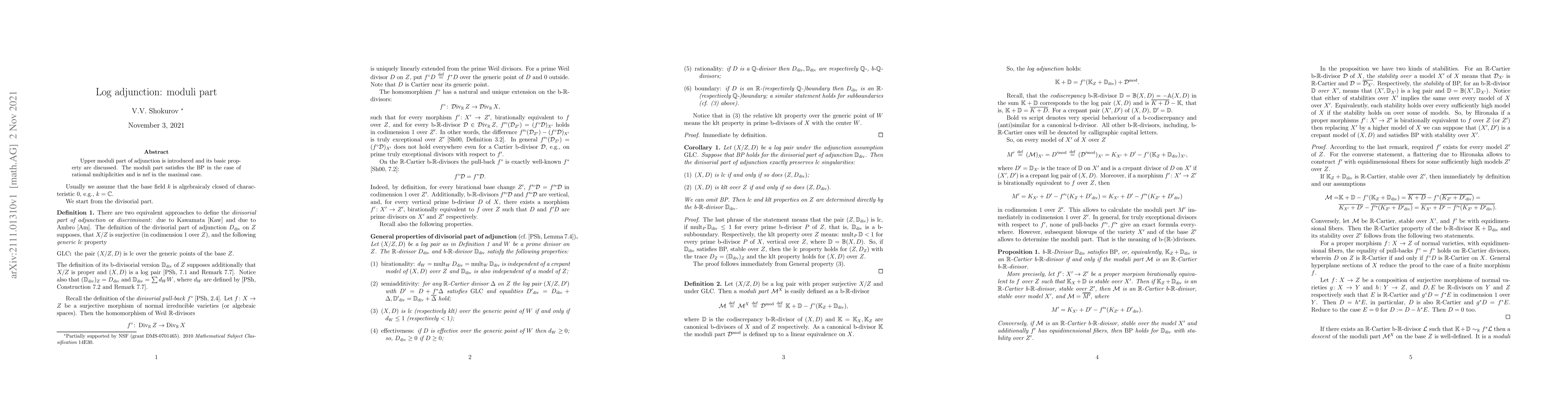 Upper moduli part of adjunction is introduced and its basic property are discussed. The moduli part satisfies the BP in the case of rational multiplicities and is nef in the maximal case.