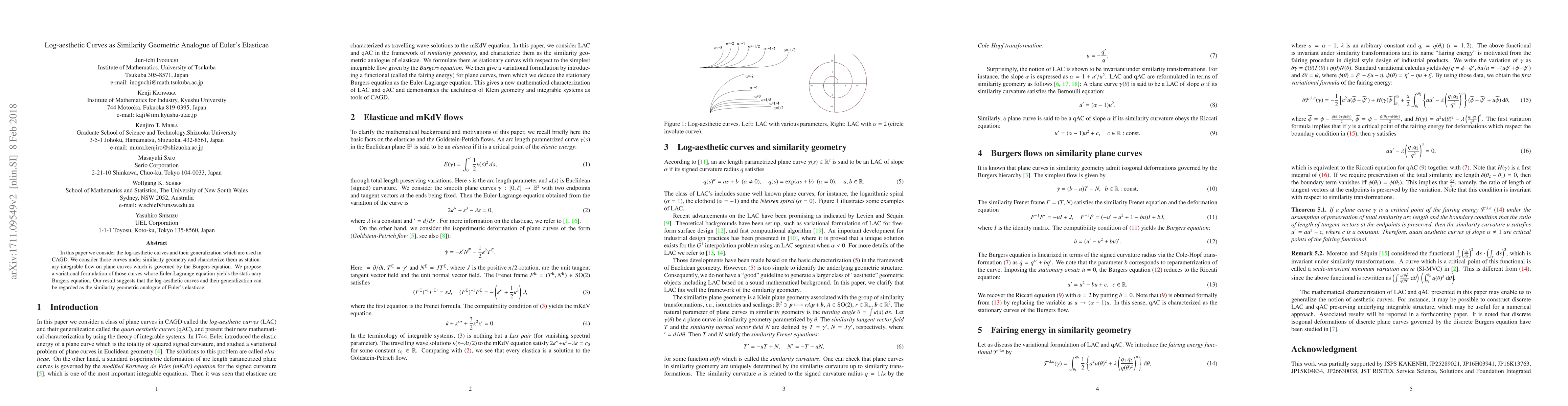 This paper explores the log-aesthetic curves and their generalizations in computational geometry, characterizing them under similarity geometry as a stationary integrable flow on plane curves governed by the Burgers equation. The study proposes a variational formulation leading to the Euler-Lagrange equation that yields the stationary Burgers equation, suggesting these curves are the similarity geometric analogue of Euler's elasticae.