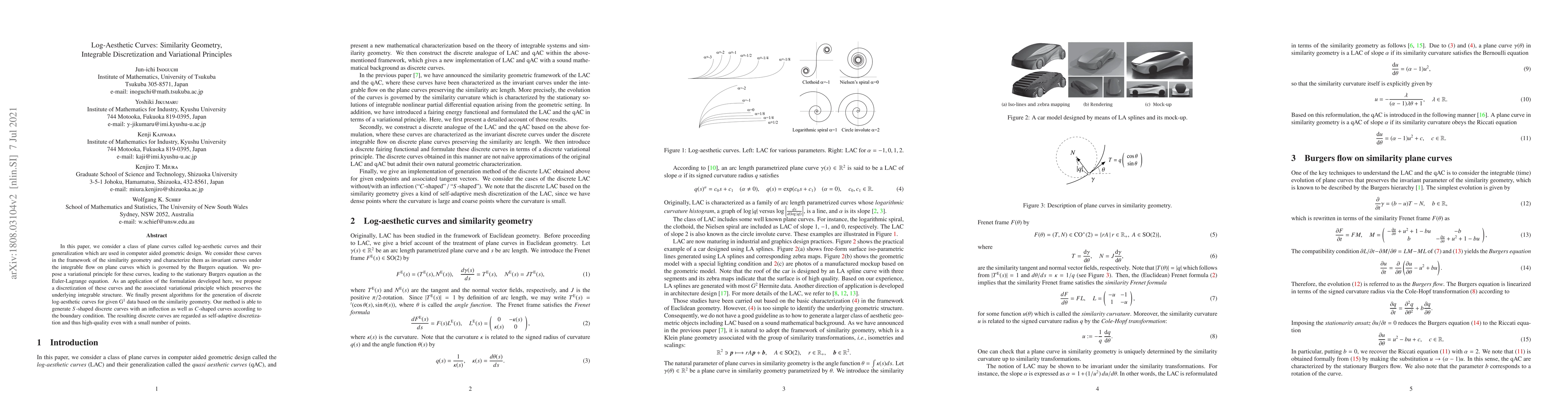 This paper explores log-aesthetic curves in computer aided geometric design, characterizing them under similarity geometry and integrable flows. It proposes a variational principle leading to the stationary Burgers equation, and develops a discretization method that preserves the underlying integrable structure, generating high-quality $S$-shaped and $C$-shaped discrete curves.