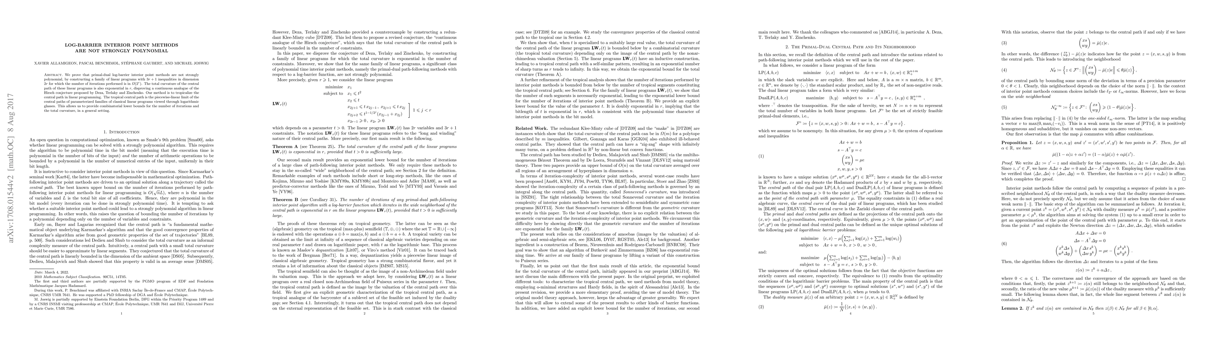 This paper demonstrates that primal-dual log-barrier interior point methods are not strongly polynomial by constructing linear programs where the number of iterations is exponential in the dimension. The authors use tropicalization of the central path to derive combinatorial lower bounds, disproving a conjecture related to the Hirsch conjecture.