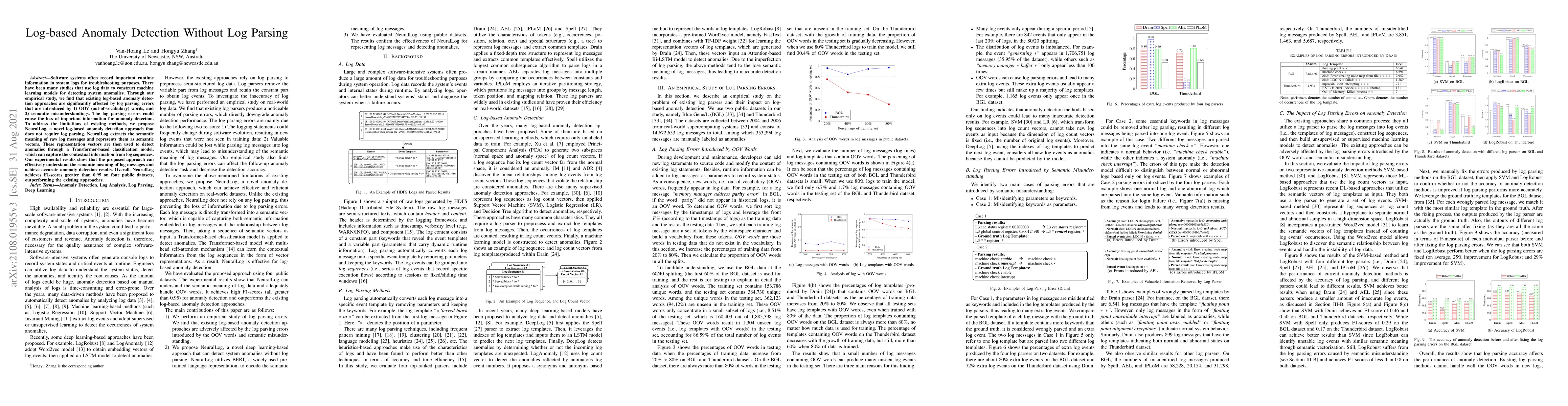 NeuralLog proposes a novel log-based anomaly detection method that avoids log parsing, directly extracting semantic meaning from raw log messages to represent them as semantic vectors. This approach uses a Transformer-based model to detect anomalies, achieving F1-scores over 0.95 on four public datasets and outperforming existing methods.