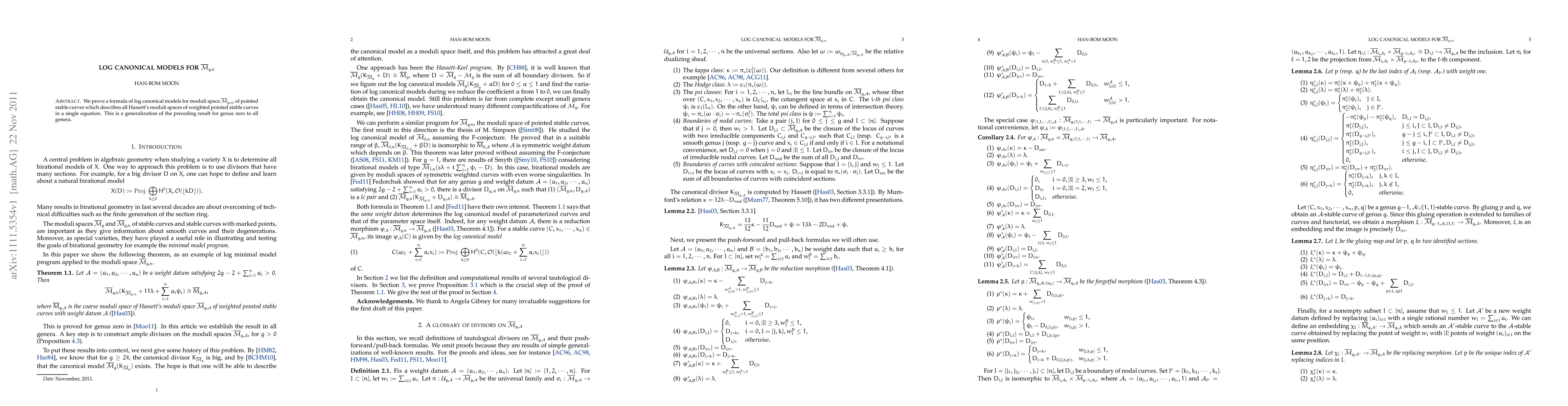 The paper establishes a log canonical model formula for the moduli space $\bar{M}_{g,n}$ of pointed stable curves, encompassing all Hassett's moduli spaces in a unified equation, extending previous genus zero results to all genera.