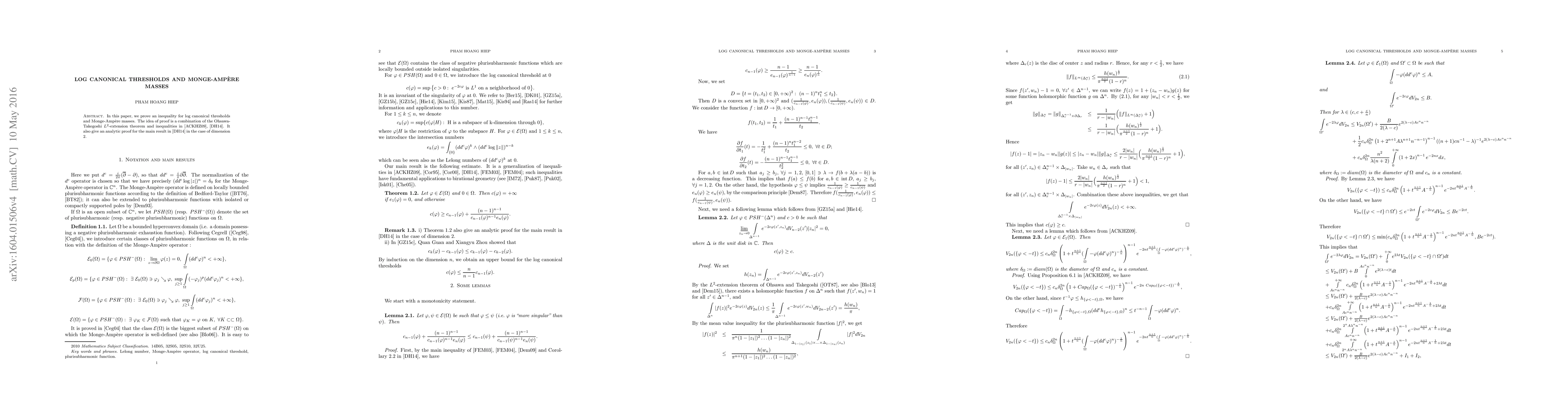 Researchers prove an inequality between log canonical thresholds and Monge-Ampere masses using Ohsawa-Takegoshi theorem and inequalities from previous works, with implications for understanding geometric and analytical properties of algebraic varieties.