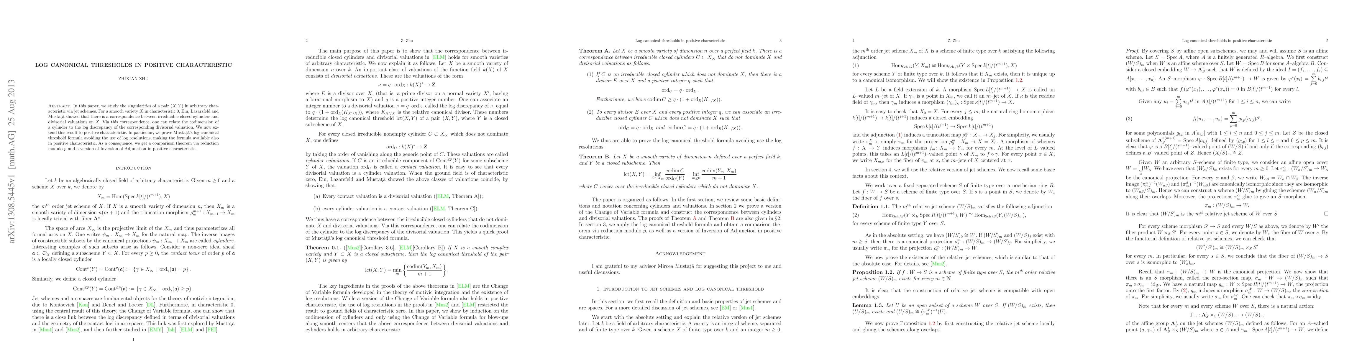 In this paper, we study the singularities of a pair (X,Y) in arbitrary characteristic via jet schemes. For a smooth variety X in characteristic 0, Ein, Lazarsfeld and Mustata showed that there is a correspondence between irreducible closed cylinders and divisorial valuations on X. Via this correspondence, one can relate the codimension of a cylinder to the log discrepancy of the corresponding divisorial valuation. We now extend this result to positive characteristic. In particular, we prove Mustata's log canonical threshold formula avoiding the use of log resolutions, making the formula available also in positive characteristic. As a consequence, we get a comparison theorem via reduction modulo p and a version of Inversion of Adjunction in positive characteristic.