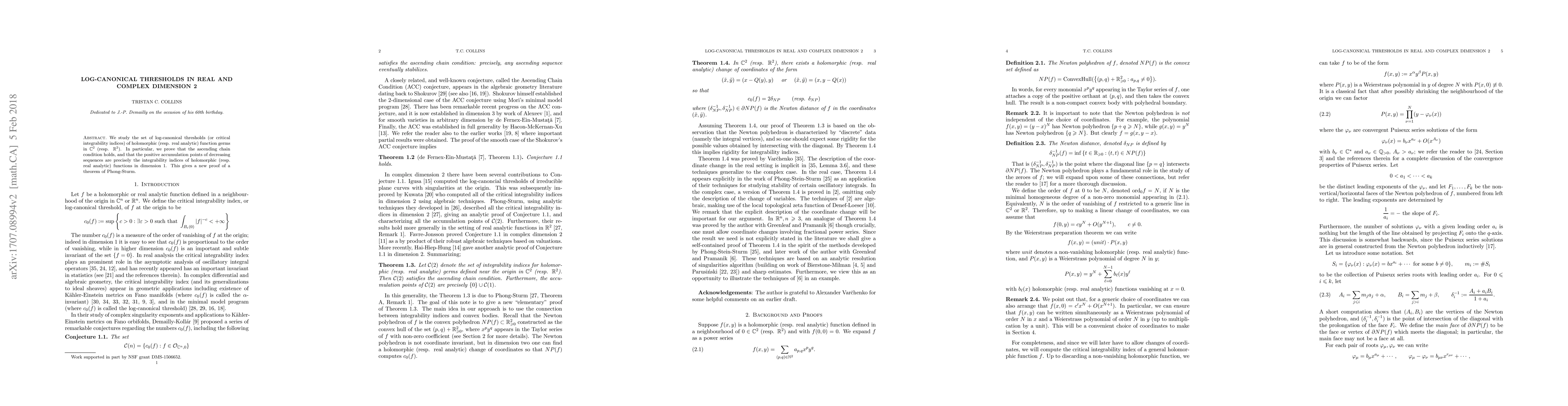 This paper investigates the log-canonical thresholds of holomorphic and real analytic function germs in $\mathbb{C}^2$ and $\mathbb{R}^2$, respectively, proving that the ascending chain condition holds and identifying the accumulation points as the integrability indices of functions in dimension $1$. This provides a new proof for a theorem by Phong and Sturm.