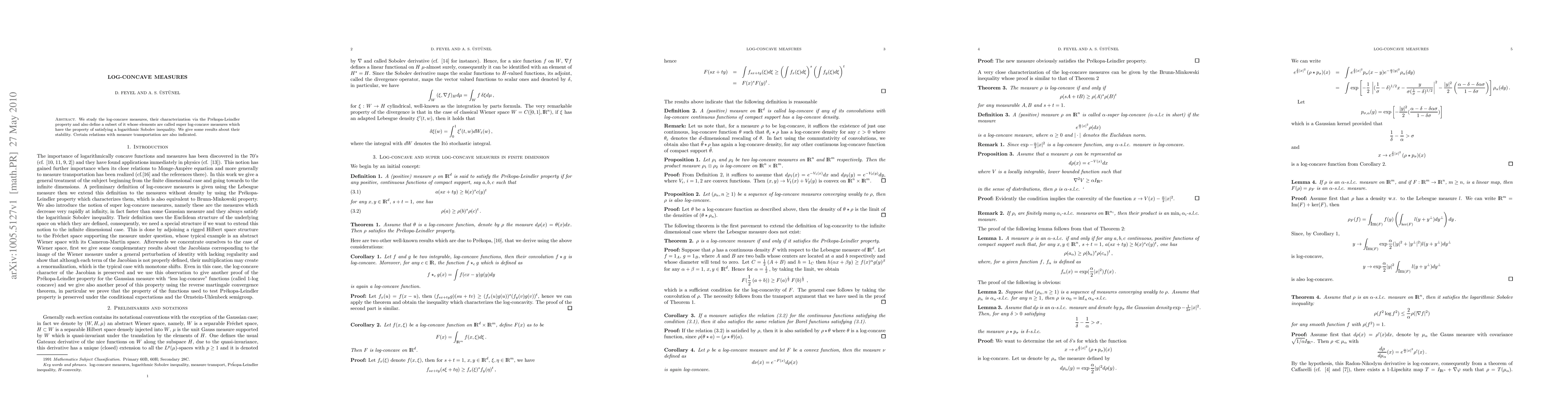 Summary: This paper characterizes log-concave measures through the Pr\'ekopa-Leindler property and introduces super log-concave measures, which satisfy a logarithmic Sobolev inequality. It also explores their stability and connections to measure transportation and the Monge-Ampère equation.