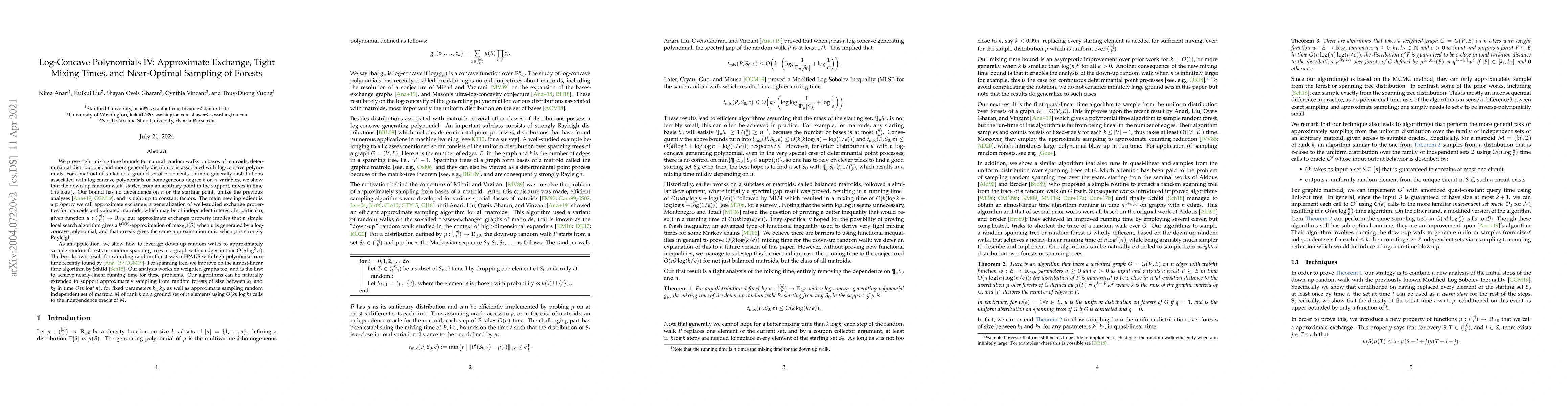 This paper establishes tight mixing time bounds for down-up random walks on matroids and log-concave polynomial distributions, proving an $O(k\log k)$ mixing time independent of $n$ and starting point. It introduces the concept of approximate exchange, which aids in near-optimal sampling of random forests and spanning trees in nearly-linear time.
