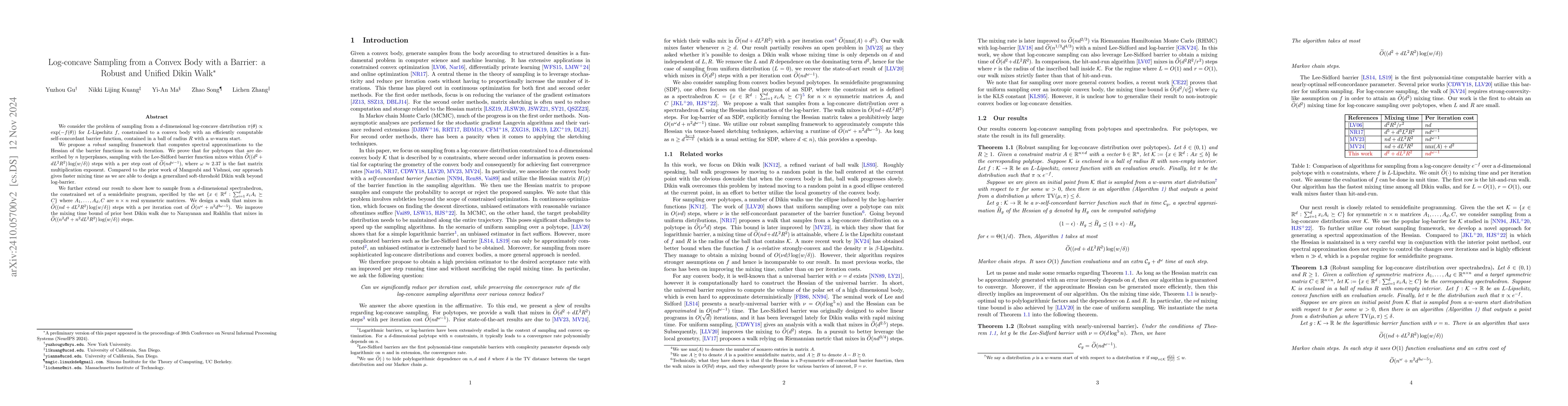 This paper proposes a robust sampling framework for log-concave distributions constrained within convex bodies, using spectral approximations to the Hessian of barrier functions. It improves mixing time over prior works, achieving faster convergence for polytopes and spectral sets, with notable enhancements in the Dikin walk approach.