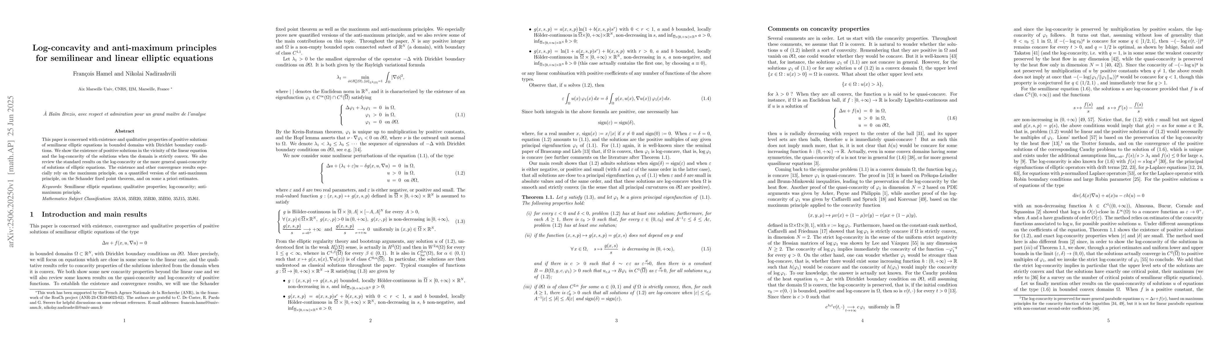 This paper is concerned with existence and qualitative properties of positive solutions of semilinear elliptic equations in bounded domains with Dirichlet boundary conditions. We show the existence of positive solutions in the vicinity of the linear equation and the log-concavity of the solutions when the domain is strictly convex. We also review the standard results on the log-concavity or the more general quasi-concavity of solutions of elliptic equations. The existence and other convergence results especially rely on the maximum principle, on a quantified version of the anti-maximum principle, on the Schauder fixed point theorem, and on some a priori estimates.