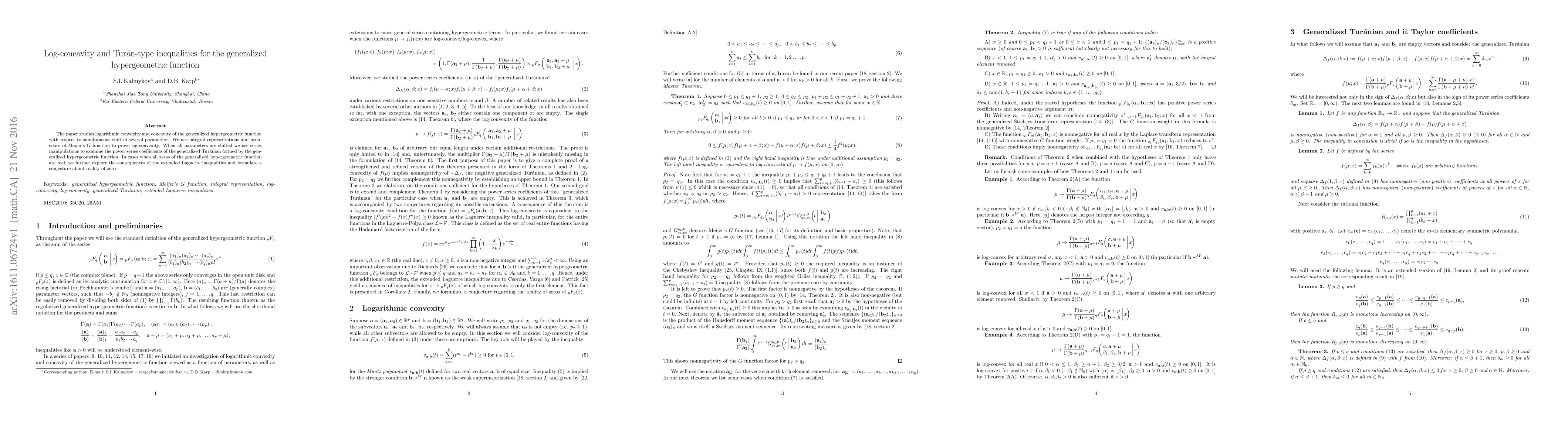 This paper investigates the log-concavity and convexity of the generalized hypergeometric function through integral representations and series manipulations, proving log-convexity and exploring the coefficients of a generalized Turánian. It also examines the reality of zeros under specific conditions, proposing a related conjecture.