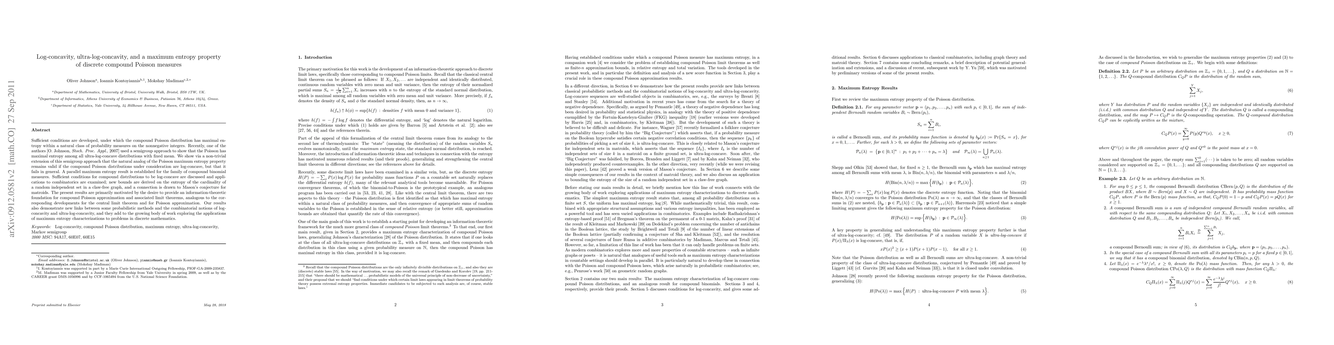 Sufficient conditions are developed, under which the compound Poisson distribution has maximal entropy within a natural class of probability measures on the nonnegative integers. Recently, one of the authors [O. Johnson, {\em Stoch. Proc. Appl.}, 2007] used a semigroup approach to show that the Poisson has maximal entropy among all ultra-log-concave distributions with fixed mean. We show via a non-trivial extension of this semigroup approach that the natural analog of the Poisson maximum entropy property remains valid if the compound Poisson distributions under consideration are log-concave, but that it fails in general. A parallel maximum entropy result is established for the family of compound binomial measures. Sufficient conditions for compound distributions to be log-concave are discussed and applications to combinatorics are examined; new bounds are derived on the entropy of the cardinality of a random independent set in a claw-free graph, and a connection is drawn to Mason's conjecture for matroids. The present results are primarily motivated by the desire to provide an information-theoretic foundation for compound Poisson approximation and associated limit theorems, analogous to the corresponding developments for the central limit theorem and for Poisson approximation. Our results also demonstrate new links between some probabilistic methods and the combinatorial notions of log-concavity and ultra-log-concavity, and they add to the growing body of work exploring the applications of maximum entropy characterizations to problems in discrete mathematics.
